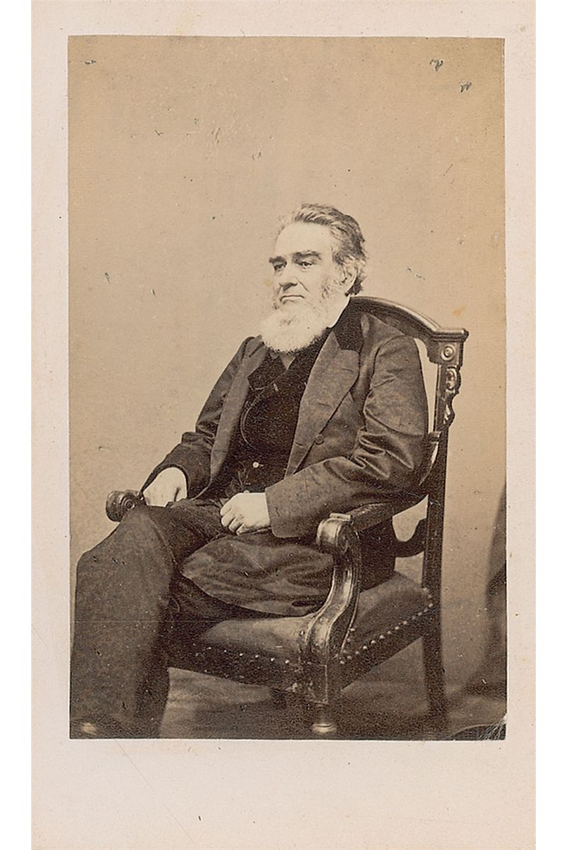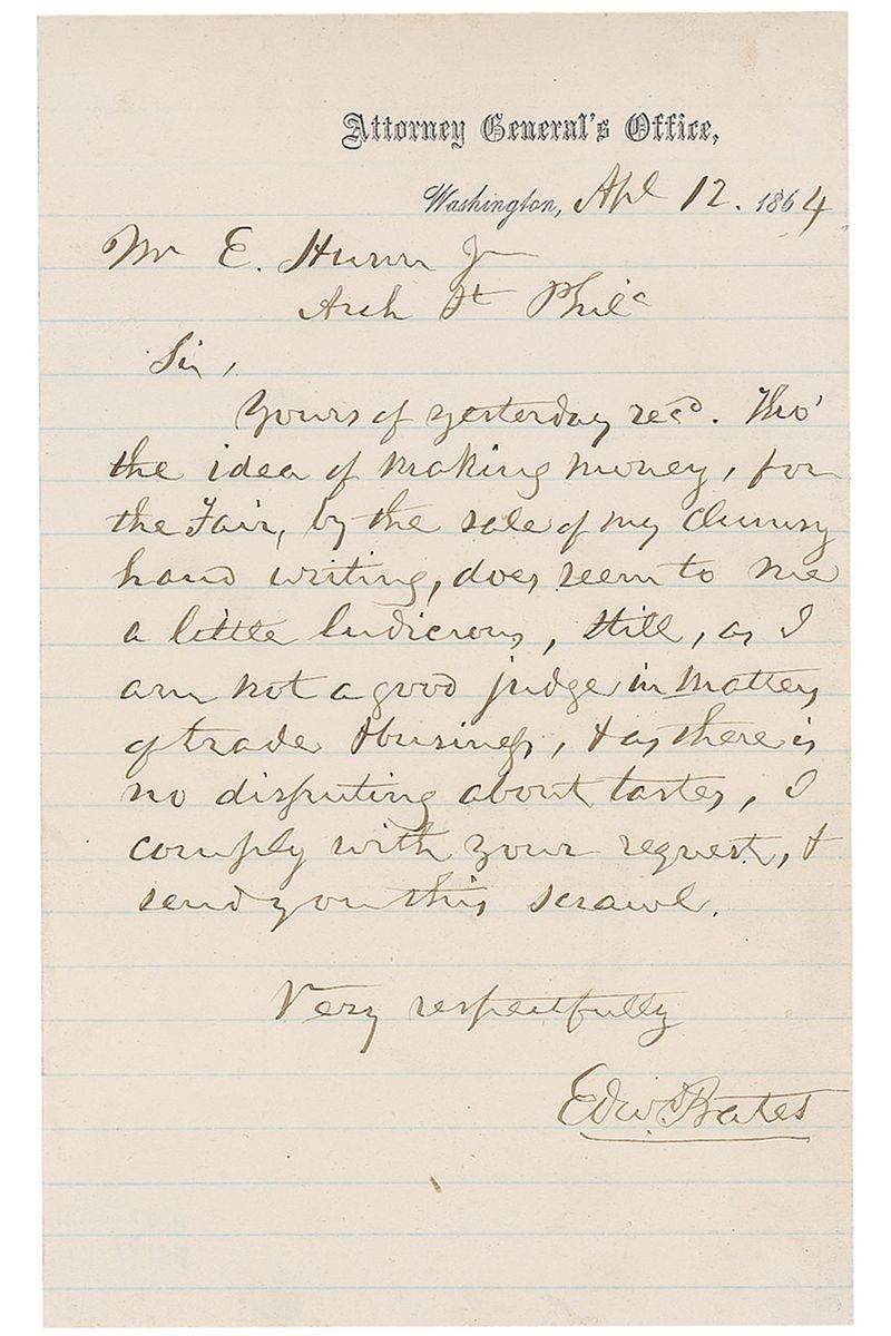 Attorney general in Lincoln’s cabinet during the Civil War (1793–1869). Civil War–dated ALS signed “Edw. Bates,” one page, lightly-lined, 5 x 8, Attorney General’s Office letterhead, April 12, 1864. Letter to a gentleman. In part: “Tho’ the idea of making money, for the Fair, by the sale of my clumsy hand writing, does seem to me a little ludicrous, still, as I am not a good judge in matters of trade & business, & as where there is no disputing about tastes, I comply with your request, & send you this scrawl.” In fine condition, with slightly trimmed edges. Accompanied by an unsigned original carte-de-visite portrait of Bates.