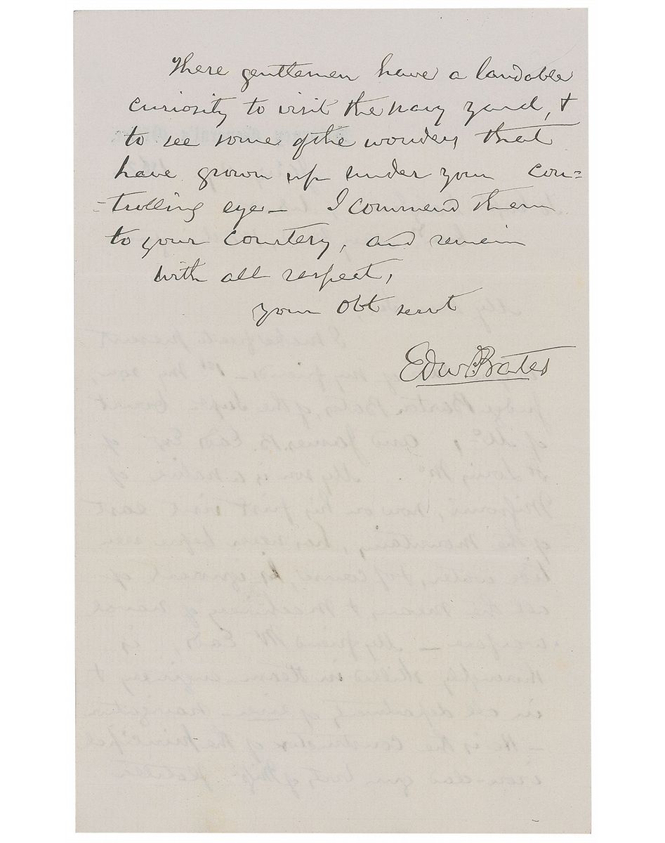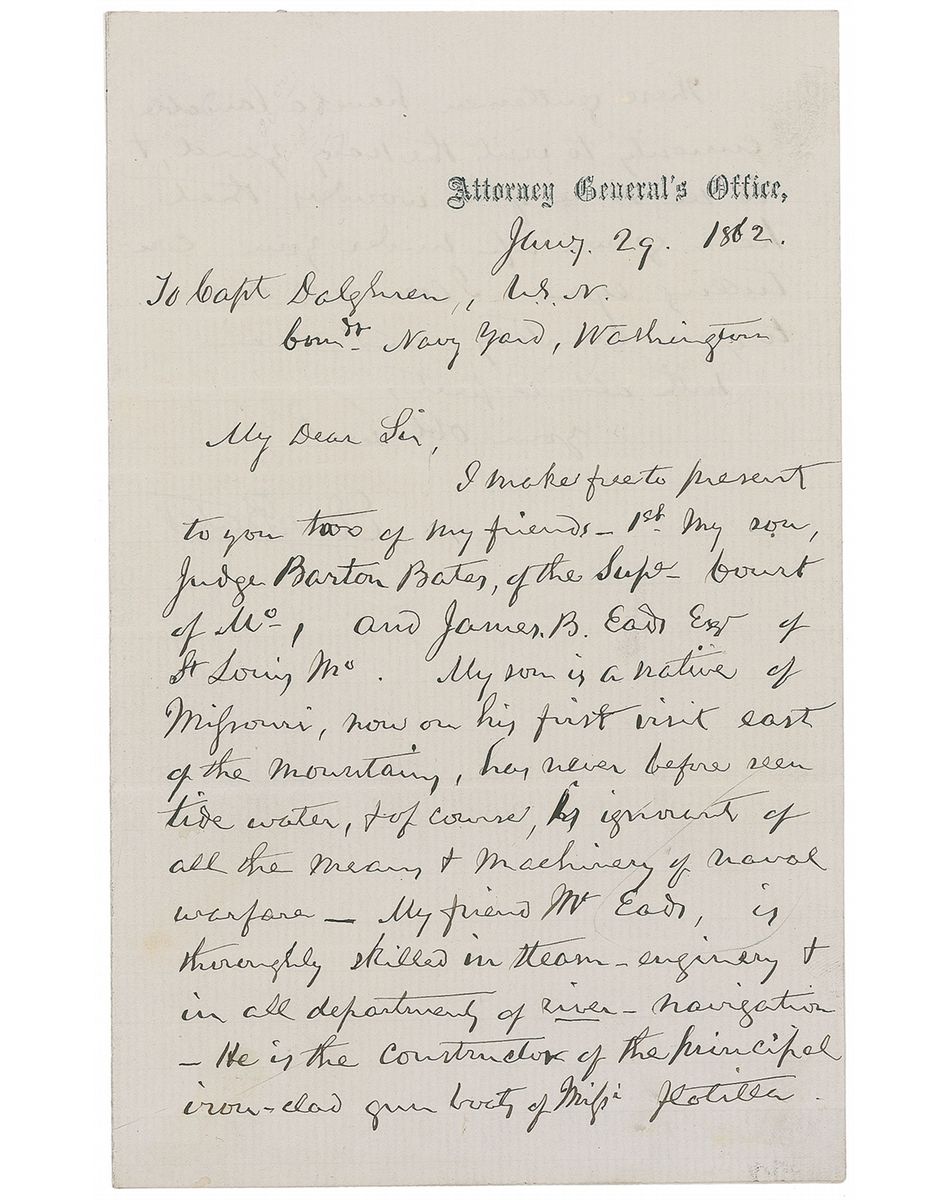 Attorney general during the Civil War (1793–1869). War-dated ALS signed “Edw Bates,” one page both sides, 5 x 8, Attorney General’s Office letterhead, January 29, 1862. Letter of introduction for ironclad builder James B. Eads to Captain John Dahlgren. In part: “I make free to present to you two of my friends. 1st my son, Judge Barton Bates, of the Sup. Court of Mo. and James B. Eads Esq. of St. Louis, Mo. My son is a native of Missouri, now on his first visit east of the Mountains, has never before seen tide water, & of course, is ignorant of all the means & machinery of naval warfare. My friend Mr. Earl is thoroughly skilled in steam enginery & in all departments of river navigation. He is the constructor of the principal ironclad gun boats of Miss. flotilla.” In fine condition. At the behest of his friend Edward Bates, Eads was contracted to construct the City-class ironclads and produced seven ships in a matter of just five months. These river ironclads were a vital element to Union naval operations.