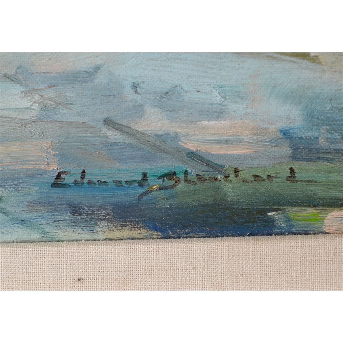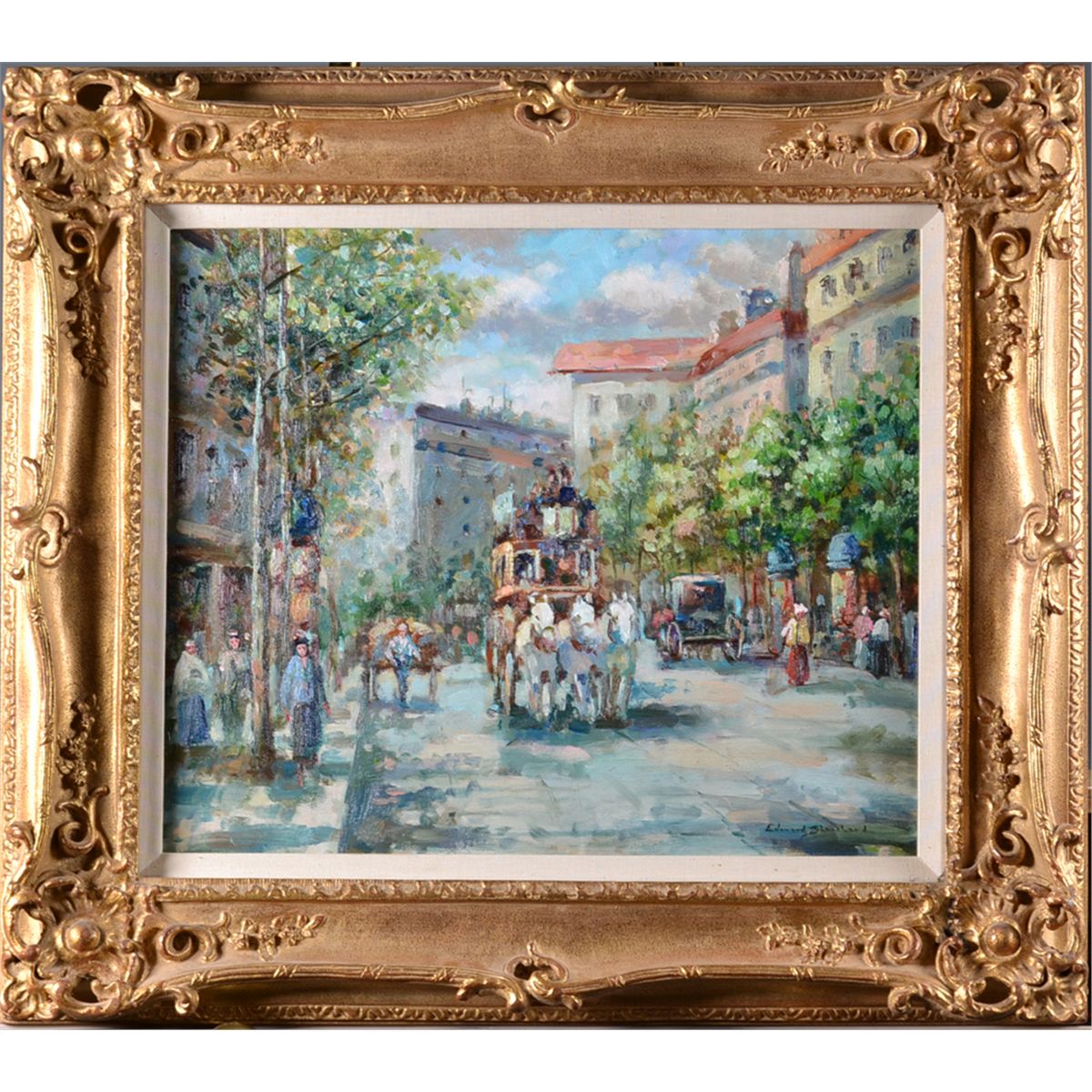 Painted to depict a French street scene with figures and horse drawn carraige. Signed Edward Blanchard in LR. Framed in a gold carved wood frame with linen mat. 19.5" H x 23.25" W, sight, 29.75" H x 33.75" W, framed. Circa 20th century. Private collection Metamora, MI.