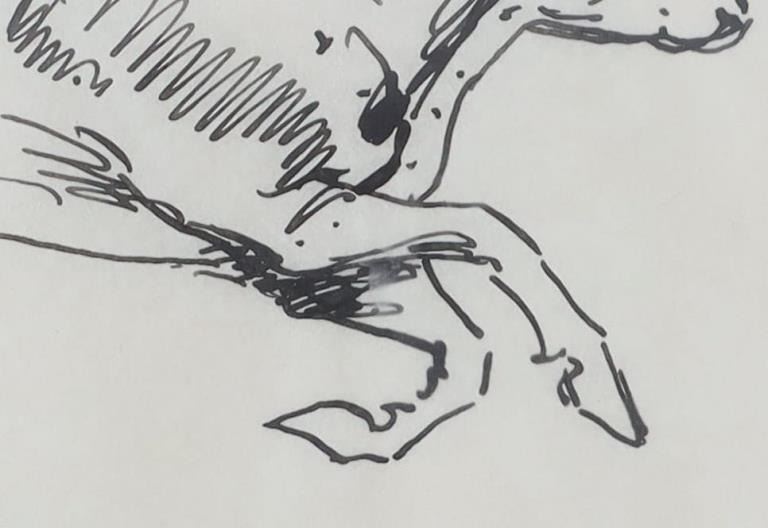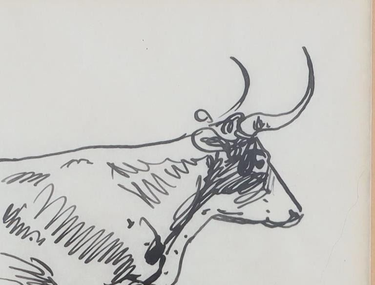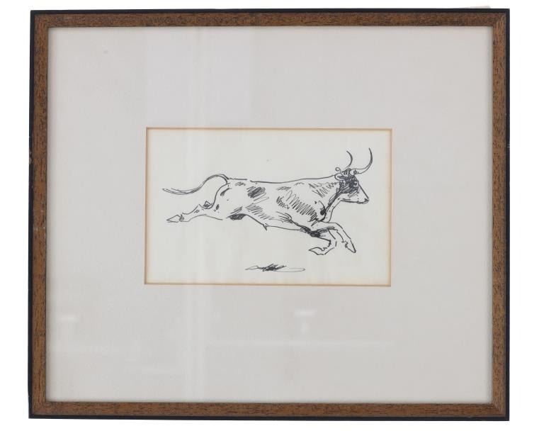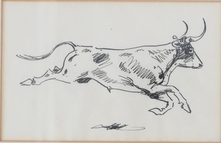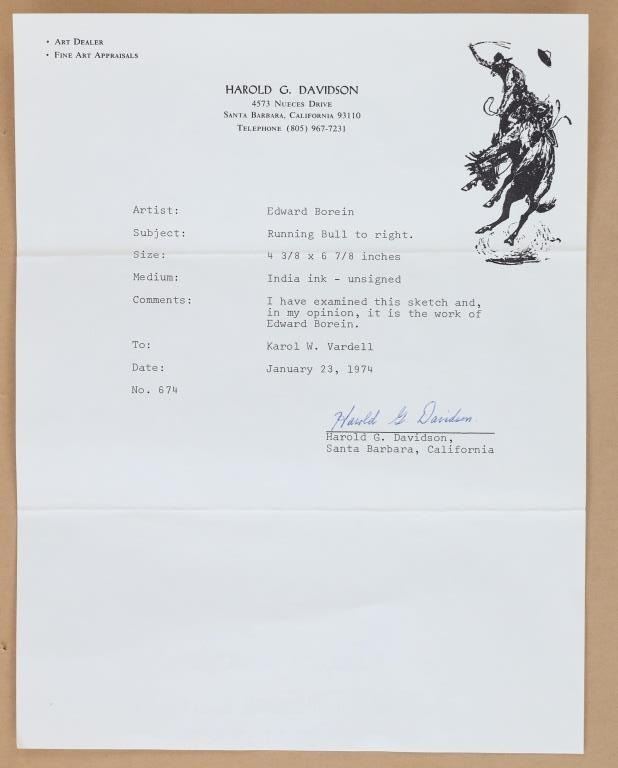 Featured in this lot is this India Ink sketch titled "Running Bull to Right," by artist Edward Borein born in 1872 and died in 1945. The sketch features a wonderfully and professionally crafted India Ink construction that features a bull running to the right. The sketch has been examined by Harold G. Davidson and has been determined to be from Edward Borein and contains the certificate of authenticity. The condition of this framed sketch is good with no obvious signs of damage and shows good overall condition. The measurements of this framed sketch is 11 3/4" x 13 3/4" and the visible art measures 4 3/8" x 6 7/8". Provenance: This artwork is from the collection of Mr. Karol Vardell.