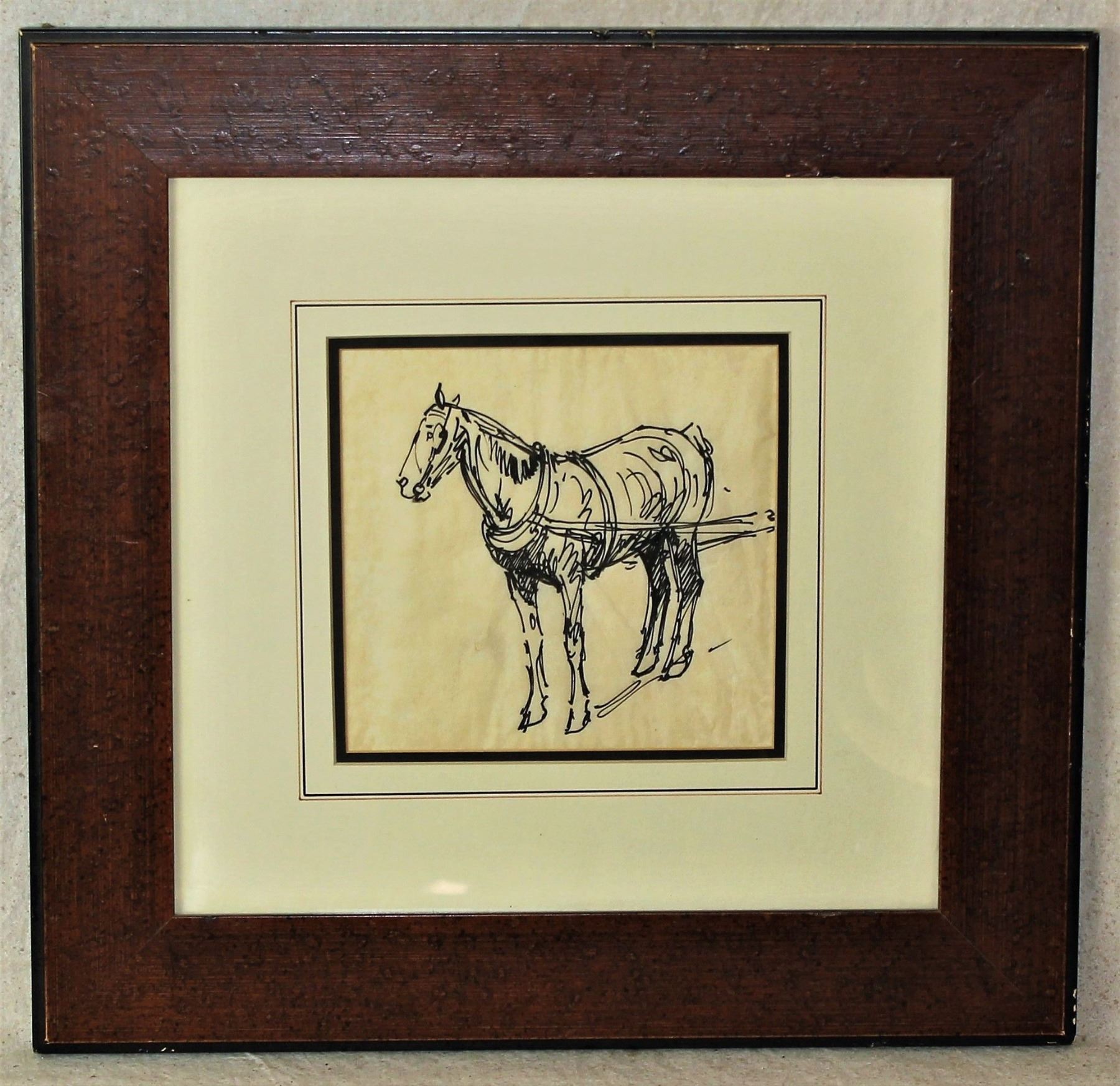 Interesting framed pen and ink drawing, titled "Harnessed", image measuring 7"x 7". To include book "Edward Borein: Cowboy Artist", by Harold Davidson.