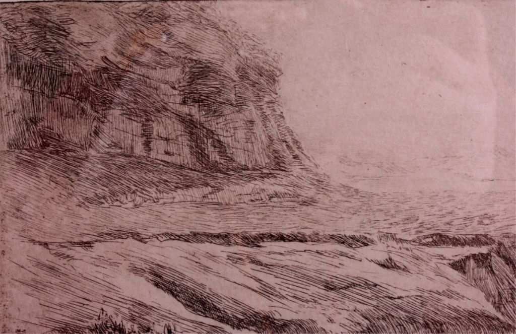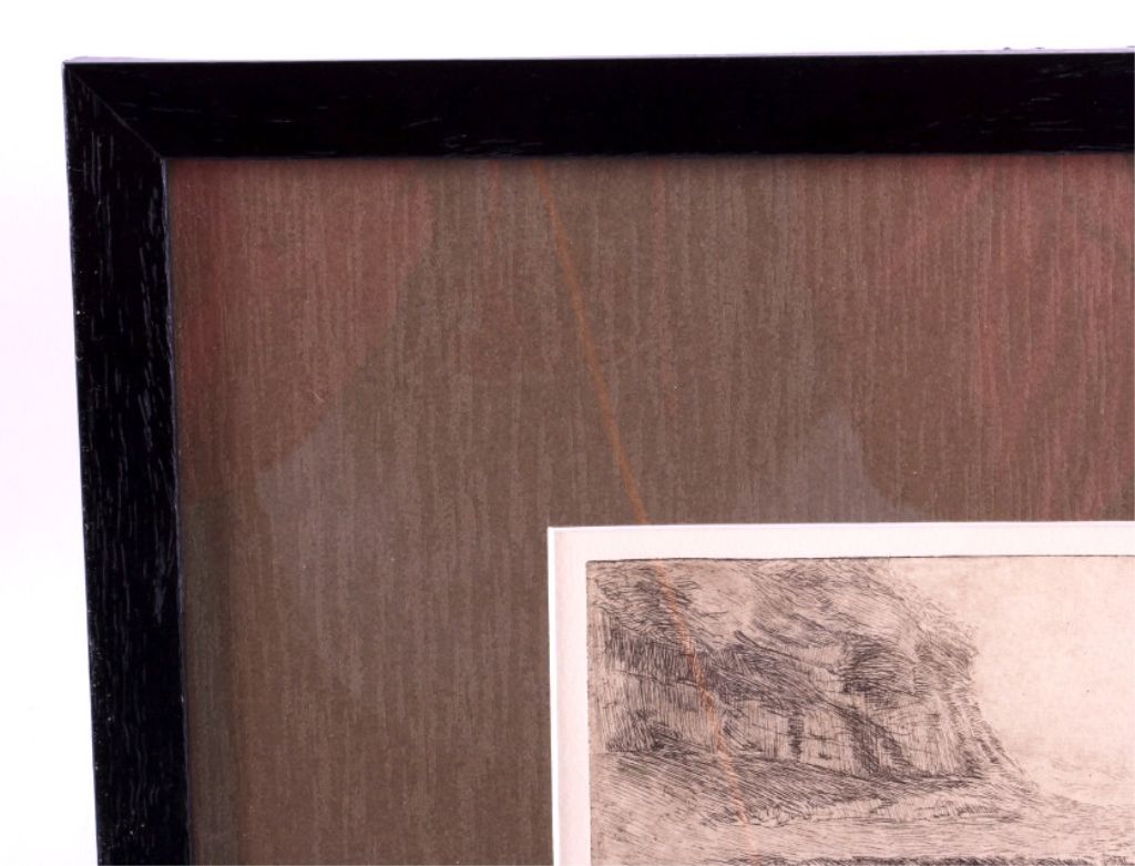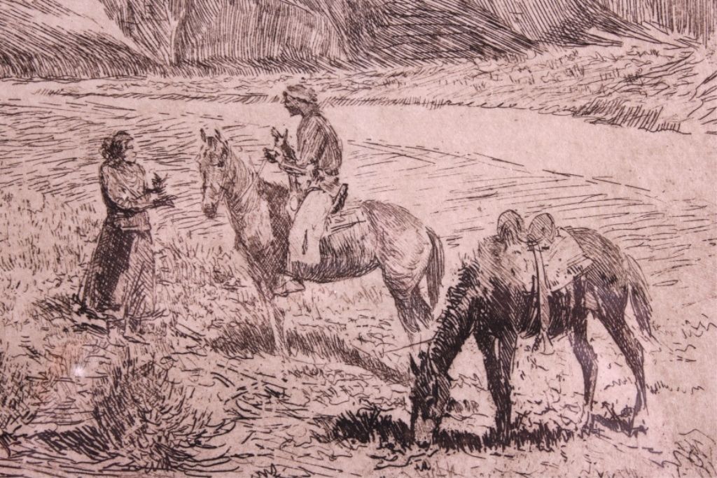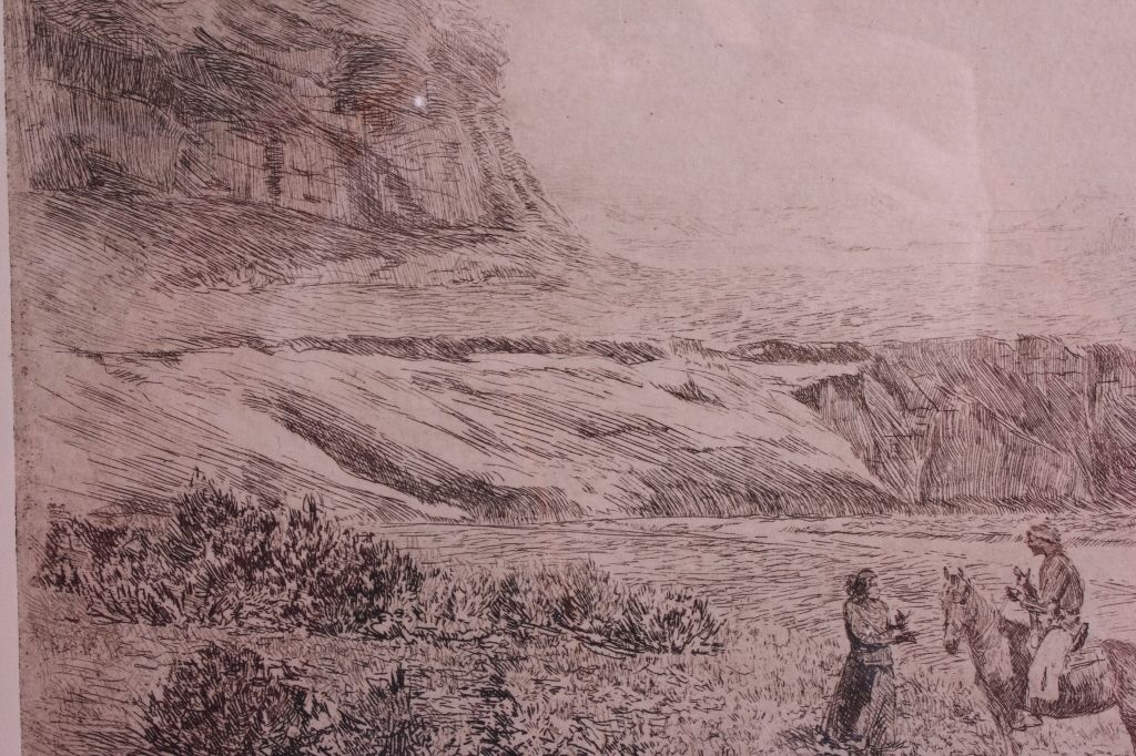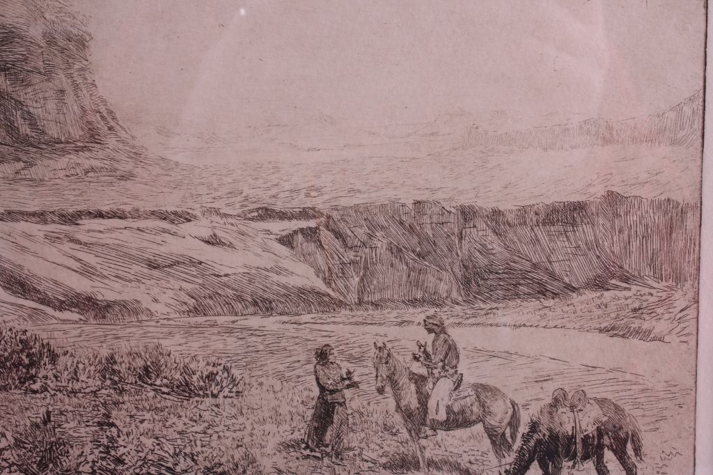 This is an Edward Borein etching titled "Gossips". Borein was a master at portraying the Native American and working ranch people, places, customs and workings of the early American West. This is a beautiful western art etching showing the magnificent Arizona landscape with two Native Americas discussing matters. This etching was made from the original copper plate after Borein's death. The etching is in very good condition. It has been professionally mattted and framed. The etching measures 6.75" x 9.5". The frame is 15.25" x 18.25".