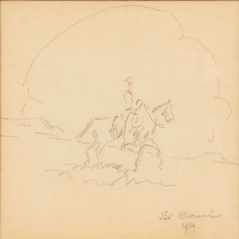 This drawing is in good condition. Inspection with the unaided eye reveals a horizontal crease about one third of the way down from the top and two small angled creases in the lower left corner. The paper is yellowing evenly. The work is mounted under glass and has not been inspected out of the frame. The frame is a burled laminate maple cap with a tan suede cloth mat and a laminate burl inner liner. The frame is in very good condition with little wear.