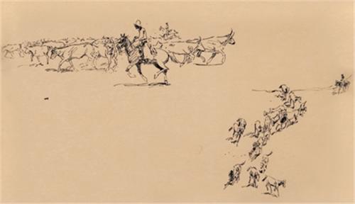 Edward Borein (1872-1945). Western Drawing #2. 7 3/4" x 11 3/4" India ink drawing. Unsigned. (est $1,200-1,500).
