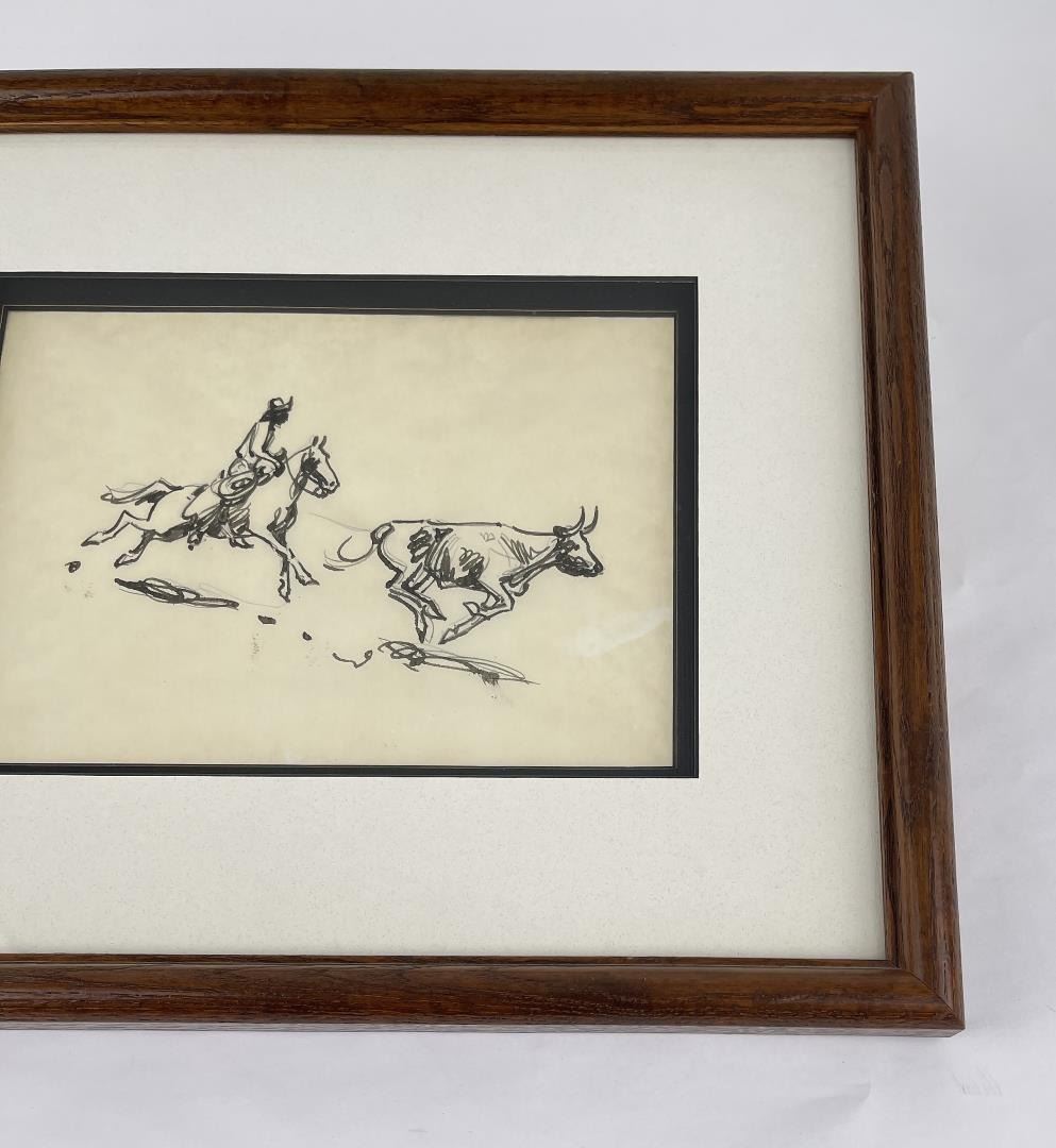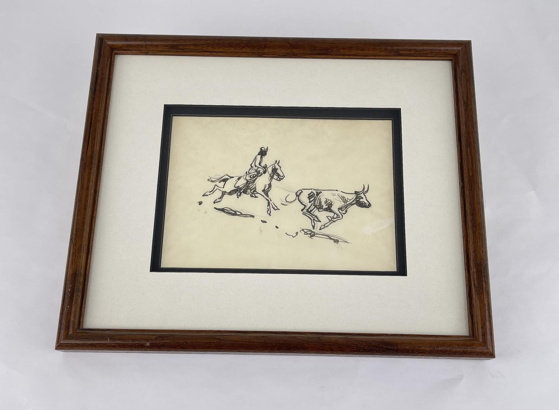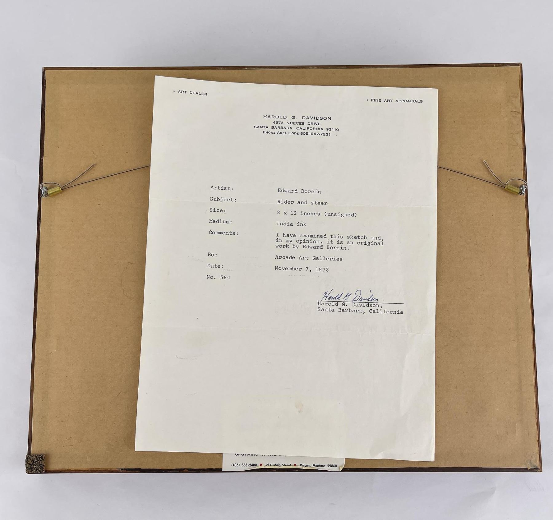 12" by 14.5" framed. Ex Harold Davidson Gallery, with letter of authenticity. Born in San Leandro, California, Edward Borein became one of the most popular artists of western scene painting, equally adept at ink drawing, watercolor, and etching. He was raised in San Leandro, a western cow town, in a family where his father was a county politician. Edward had many childhood memories of herded cattle and their cowboys, which he began sketching at the age of five. He was educated in the Oakland, California schools, and at the age of 17 began working on a ranch near Oakland and then drifted and sketched as a working cowboy throughout the Southwest, Mexico, and Guatemala. It was said that he practiced his art on anything he could find from bunkhouse walls to scraps of paper. At age 19, he enrolled at the San Francisco Art School, his only formal art training, and there he met Jimmy Swinnerton and Maynard Dixon who encouraged him in his art career. The first person to purchase his work was Charles Lummis, editor of The Land and Sunshine magazine in California, and the two became life-long friends. Borein and Lucille Maxwell were married in the Lummis home. Borein, a typical westerner in dress and manner, also became close friends with Charles Russell, actor Will Rogers, and President Theodore Roosevelt. Borein often traveled north to visit Russell in Great Falls, Montana and to travel among Indian tribes. In 1899, Borein visited Arizona while returning from Mexico. By 1902, he was a successful illustrator in San Francisco for the San Francisco Call, and in 1907 to enhance his illustration skills, went to New York to learn etching techniques. There he enrolled in the Art Students League and was a student of Child Hassam. In the theatre district, he opened a studio that became a gathering place for 'lonesome' westerners such as Charles Russell, Will Rogers, Olaf Seltzer and Oscar Borg. But Borein did not feel at home in New York, so he moved to Santa Barbara, California in 1921. This was a final move. He and his wife built a Hopi-style home, and he taught at the Santa Barbara School of the Arts until his death, and also turned increasingly from oil to watercolor painting. "On occasion Borein would decorate place cards for dinners with small watercolor sketches of cowboys, vaqueros, Indians and Bucking horses". (Santa Fe Auction) From his studio, which again attracted many of his friends, he depicted Indians, cowboys, and California ranch life and was financially successful.