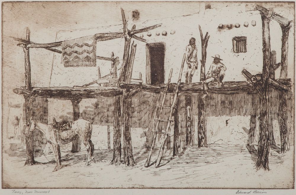 Edward Borein. The Ramada. 6 7/8" x 10 3/16". Etching and drypoint. Signed lower right and titled lower left, "Taos, New Mexico" in pencil. Framed and matted to 11 1/4" x 15 3/4". #238 in Galvin.