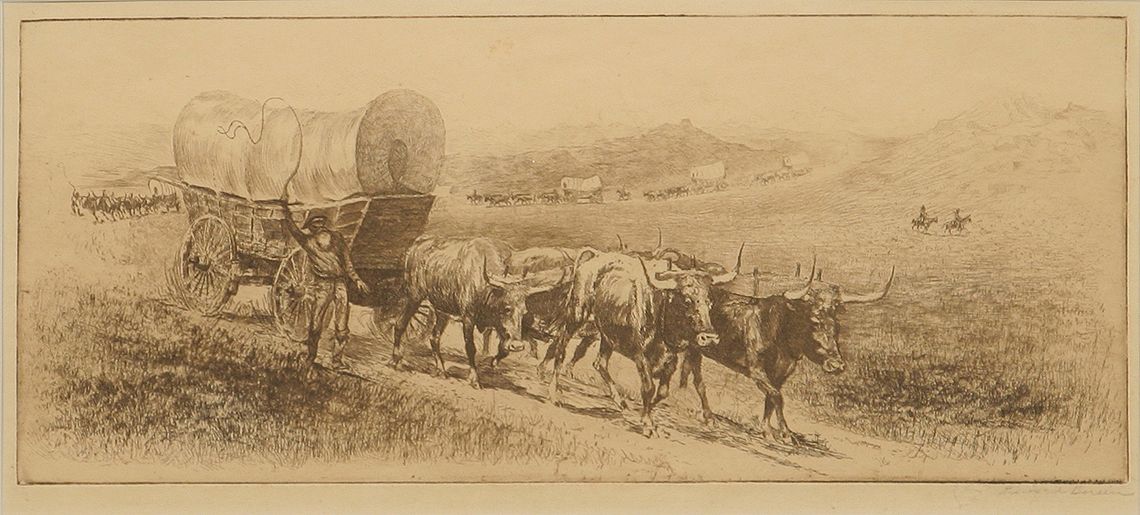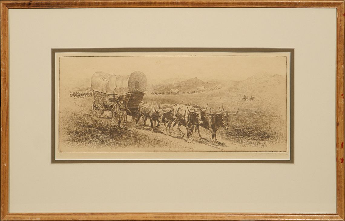 Edward Borein (1872-1945). Emigrant Train (G. 148). 5 ?" x 14" etching. Signed lower right margin: Edward Borein. (est. $1,800-2,200). CONDITION REPORTS: www.auctioninsantafe.com/docs/cr2012.pdf