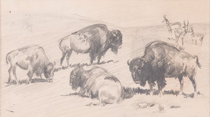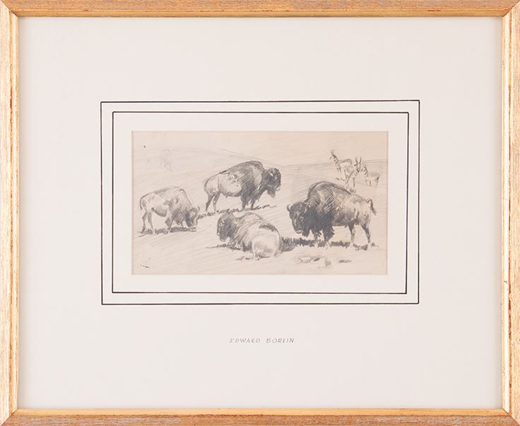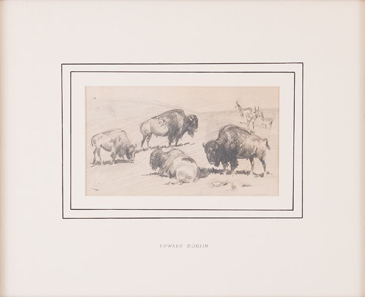 Edward Borein (1872-1945). Lazy Sunday. 5" x 9" original pencil sketch. Edward Borein on center mat. Verso: Note from Harold G. Davidson (Santa Barbara, CA), dated November 18, 1968. Provenance: Found in the Borein estate. Authenticated by Harold Davidson in 1968.