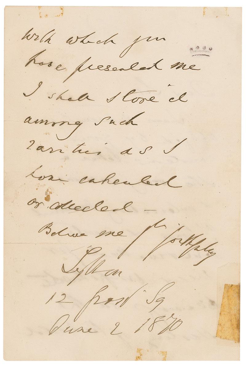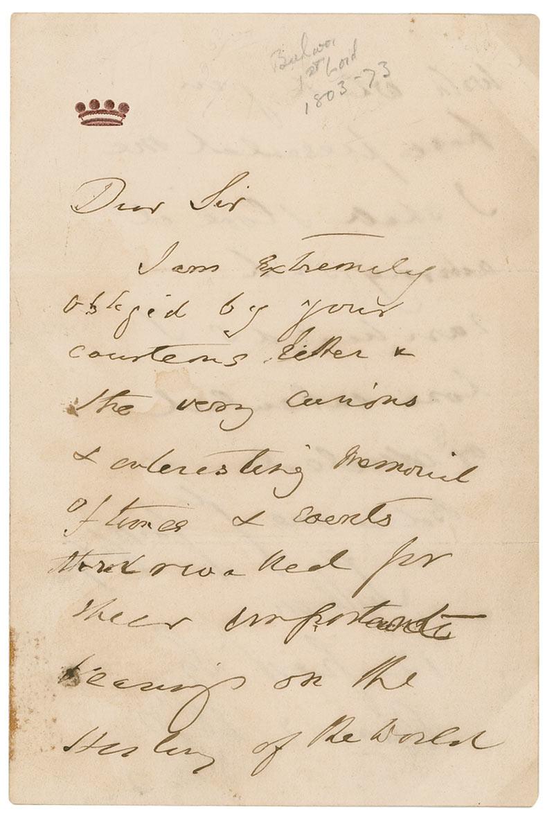 English politician, poet, playwright, and prolific novelist. He was immensely popular with the reading public and wrote a stream of best-selling novels which earned him a considerable fortune. Among the phrases he coined: ‘The pen is mightier than the sword’ and the famous opening line, ‘It was a dark and stormy night.’ ALS signed “Lytton,” one page both sides, 4 x 6, June 2, 1870. Letter to an unknown gentleman. In part: “I am extremely obliged by your courteous letter & the very curious & interesting memorial of times & events…on the History of the World.” In very good condition, with scattered toning and soiling, several tape remnants, partial separation along hinge, and mounting remnants to reverse of second integral page. Accompanied by an unsigned carte-de-visite portrait.