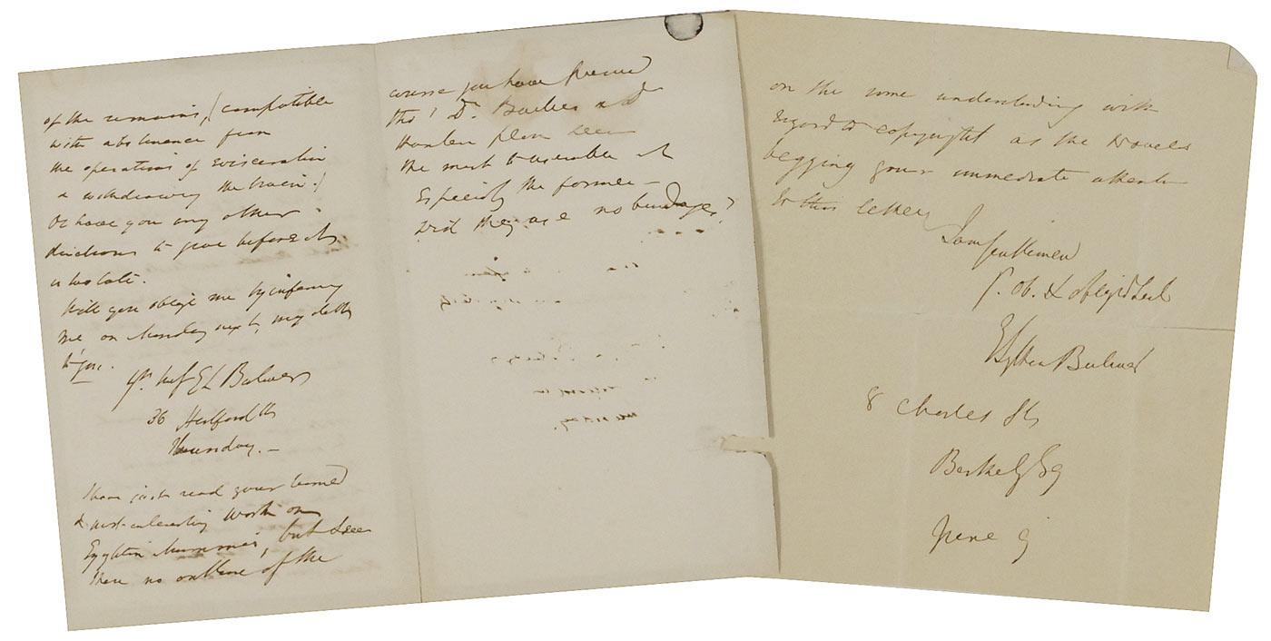 English politician, poet, playwright, and prolific novelist. He was immensely popular with the reading public and wrote a stream of best-selling novels which earned him a considerable fortune. Among the phrases he coined: “the pen is mightier than the sword" and the famous opening line, "it was a dark and stormy night.” Two items: ALS, no date, on black-edge mourning stationery, signed “E. L. Bulwer,” written in his difficult to decipher hand regarding a coffin; and a partial ALS signed “E. Lytton Bulwer.” In very good condition, with partial separation along the hinge of the first letter, intersecting folds to the partial ALS, and scattered toning.