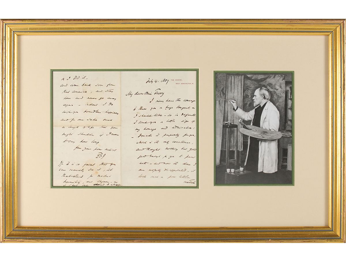 British artist and designer (1833–1898) closely associated with the later phase of the Pre-Raphaelite movement. ALS signed “EB.J,” four pages on two adjoining sheets, 4.25 x 6.5, personal letterhead, July 14, 1887. Letter to English actress Ellen Terry, in part: “So in default I send you a little sign of my homage and admiration: I made it purposely for you, which is its only excellence, and thought nothing but gold good enough for you to paint with—and now it is done I am woefully disappointed—it looks such a poor little wretch of a thing, and there is not time to make another before you go—not holding it up to the light, but putting it in a corner—and never shewing it…But I wanted it to be so different and my old eyes cannot help me to finish as I want.” Nicely double-matted and framed with a portrait of the painter at his easel to an overall size of 19.5 x 12.75, with a window on the reverse for viewing the inside of the letter and the original envelope. In fine condition, with scattered soiling (most noticeable to the pages on the reverse). Burne-Jones was an avid admirer of Terry, and after having watched her in Amber Heart on three different occasions, he described her performance as ‘not acting—it is a glimpse of Nature itself.’ The actress soon became a source of artistic inspiration for Burne-Jones, who designed Terry’s costumes for her 1895 role in King Arthur.