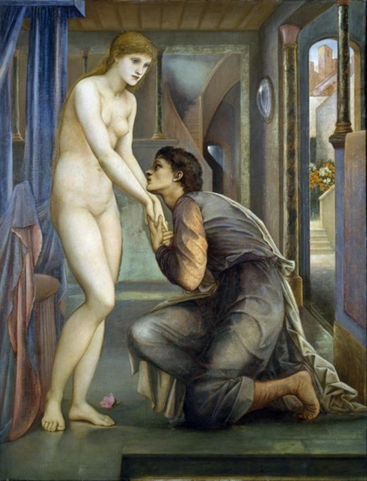 Artist: Edward Burne-Jones - Title: Pygmalion and the Image II - Medium: Fine Art Reproduction Giclee on Canvas - Image Size: Approximately 20 inches x 15.25 inches - Unframed on Unstretched Canvas - Biography: Sir Edward Coley Burne-Jones, 1st Baronet, (28 August 1833 - 17 June 1898) was a British artist and designer associated with the phase of the Pre-Raphaelite movement, who worked with William Morris on decorative arts as a founding partner in Morris, Marshall, Faulkner & Co.