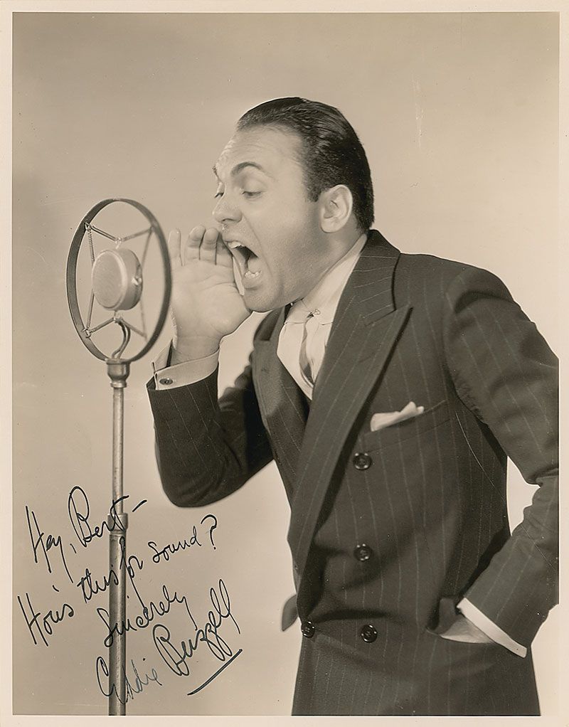 Film director (1900–1985) whose credits for MGM included the Marx Brothers films At the Circus and Go West, and the musical Best Foot Forward with Lucille Ball. Humorous vintage glossy 7.5 x 9.75 photo of Buzzell yelling into a microphone, signed and inscribed in fountain pen, “Hey, Bert—How’s this for sound? Eddie Buzzell.” In fine condition.