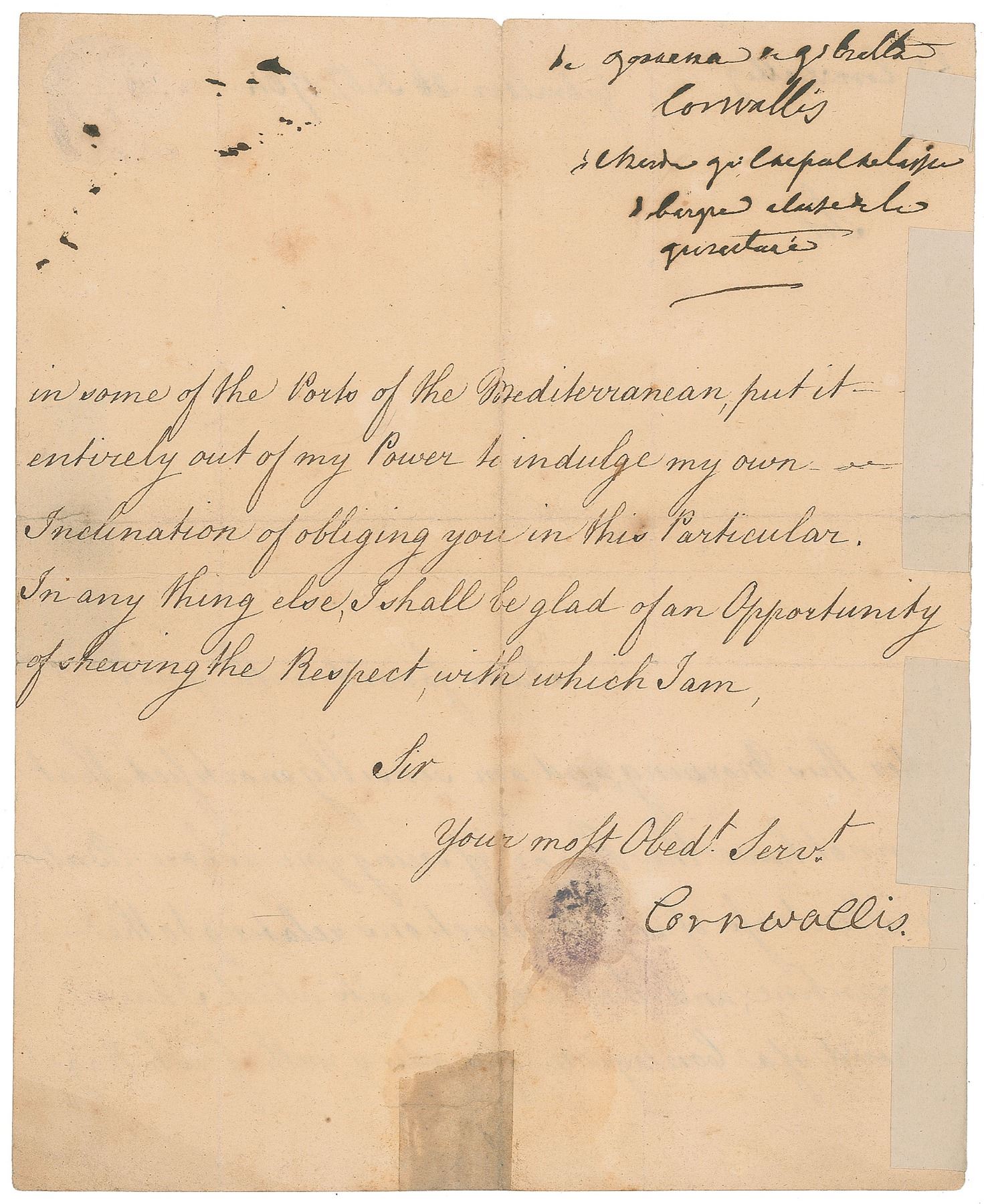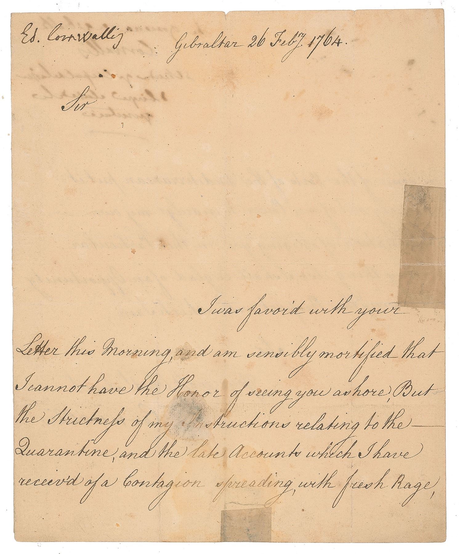 LS signed “Cornwallis,” one page, 7 x 8.75, February 26, 1764. Timely letter as governor of Gibraltar, where he had implemented a quarantine on incoming ships due to sickness spreading across the Mediterranean. In full: "I was favor'd with your Letter this morning, and am sensibly mortified that I cannot have the Honor of seeing you ashore, But the Strictness of my Instructions relating to the Quarantine, and the late accounts which I have receiv'd of a Contagion spreading, with fresh Rage, in some of the Ports of the Mediterranean, put it entirely out of my Power to indulge my own Inclination of obliging you in this Particular." In very good condition, with scattered staining, and old tape along the trimmed edges.