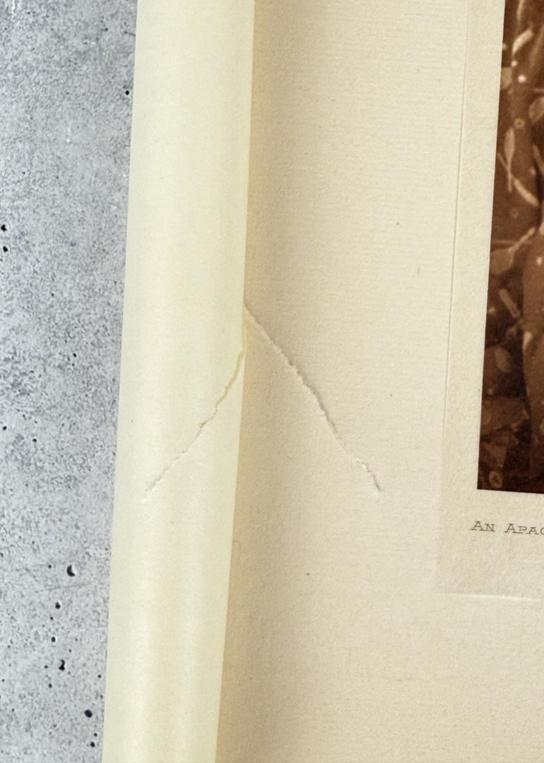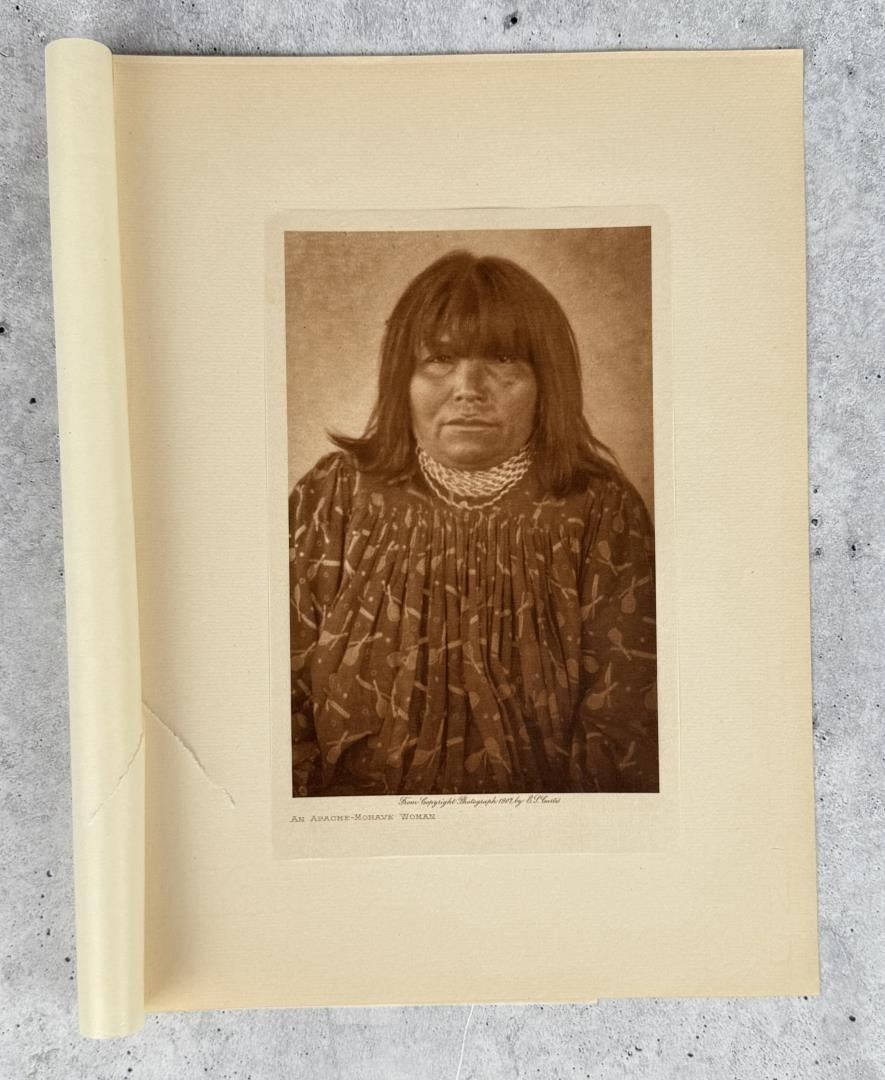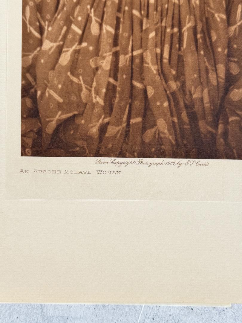 Original 1908 Gampi Tissue Photogravure from Edward Curtis The North American Indian Volume 2. 9" by 12". Cover and Mounting paper are torn but tissue is undamaged.