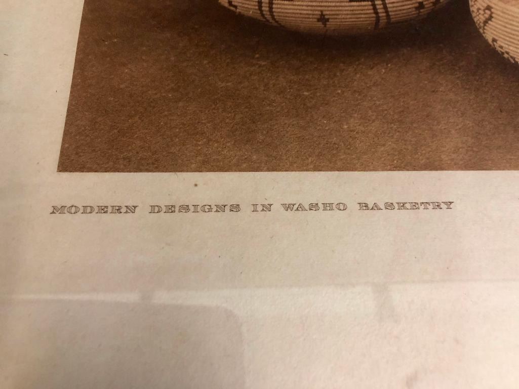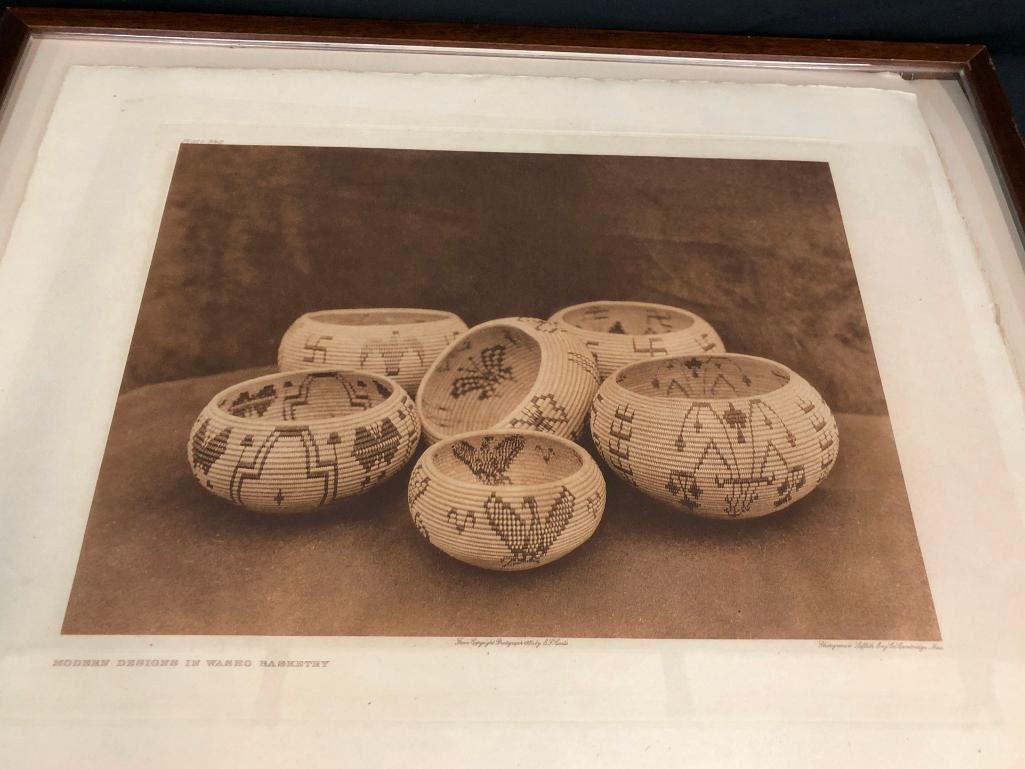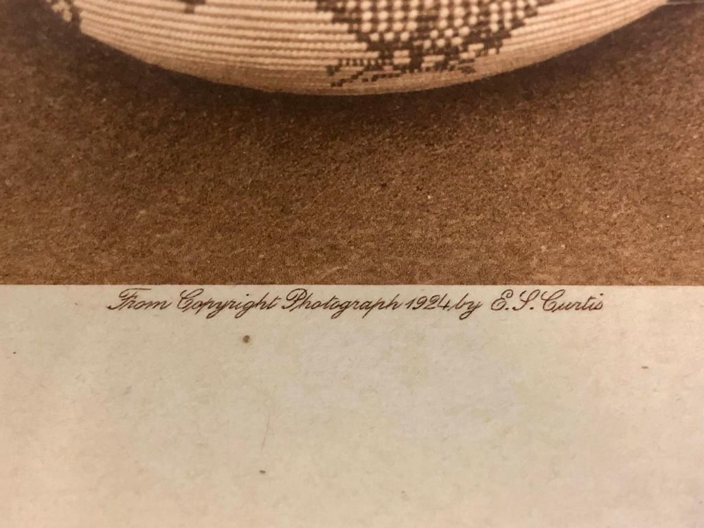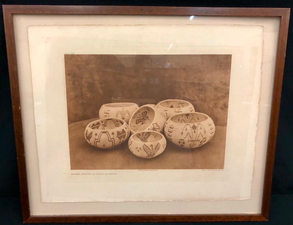 For sale in this lot is an original Edward Curtis photogravure print titled, Modern Designs in Washo Basketry. It has been professionally framed. MAKER: Edward Curtis. APPROX AGE: Original photo taken in 1924. SIZE: 25-3/4 inches wide X 21-5/8 inches tall including frame. CONDITION: Good for its age, normal wear expected. Please look closely at the pictures as they are an important part of our description and are hereby incorporated into the description, specifically with regards to condition. SHIPPING: There will be a $10 handling / packaging fee for shipping this lot. The actual cost of postage will be added on top of that. BUY IT NOW: If you would like to buy this item now, without waiting for the auction day to bid on it, we do offer this option (which is available up to 48 hours before the actual auction starts). The “Buy it Now” price is the high estimate of this lot (plus applicable fees and the Buyer's premium is discounted to 10% when using the Buy it Now option). If you would like to exercise this option, you must contact us by email (or phone as long as you talk to someone live). Reference this lot number and your intention to "Buy it Now."