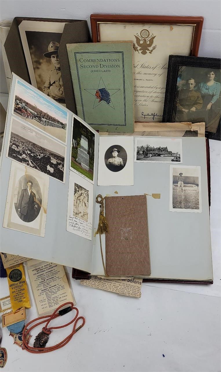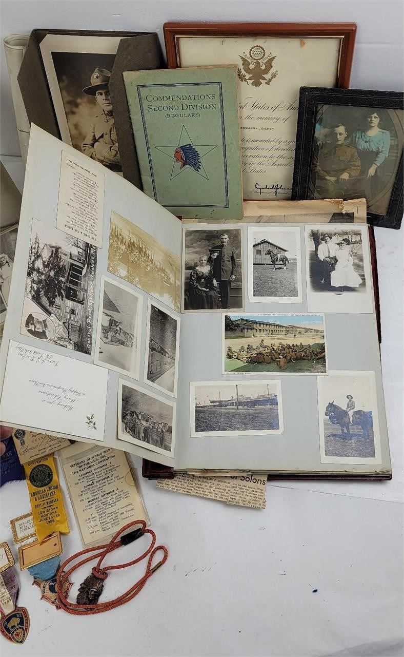 Very nice historical lot. It includes many of his photos, papers, and documents, as well as postcards and other ephemera in the album from his service. Soldiers name was Edward L. Dickey, he served in the 2nd Infantry.