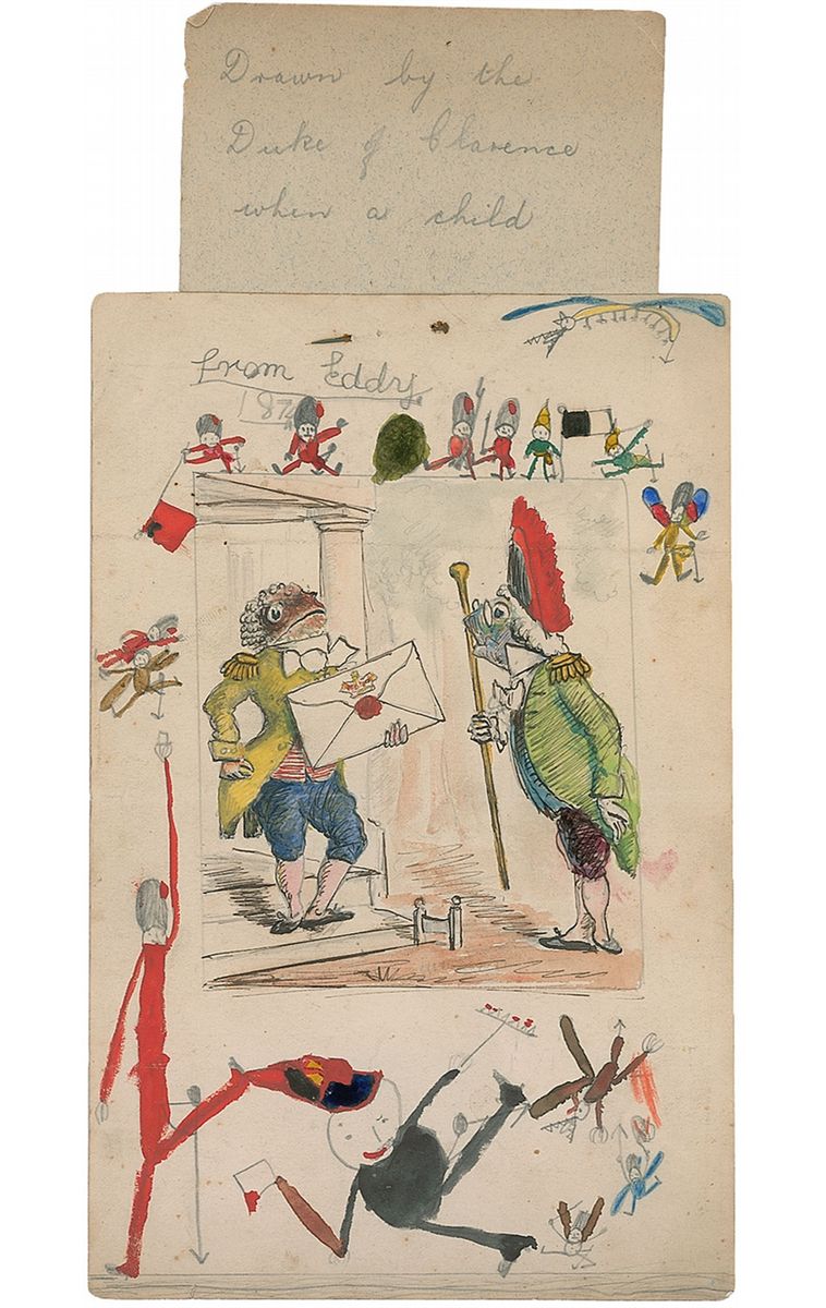 Eldest son of King Edward VII (1864–1892) whose sanity was a topic of much speculation—with some going so far as to propose he was the infamous serial killer Jack the Ripper. Extremely rare and well-done original ink and paint art work of two formally dressed frogs, one carrying a sealed letter, on an off-white 5 x 8 sheet, with several smaller pencil and paint figures surrounding the borders. Notation at top of sheet, in pencil, reads, “From Eddy.” A note pinned to top of sheet, written by his former governess reads, “Drawn by the Duke of Clarence when a child.” Scattered soiling, otherwise fine condition. Rare and well-executed artwork from the much speculated about royal who died at the young age of 28.
