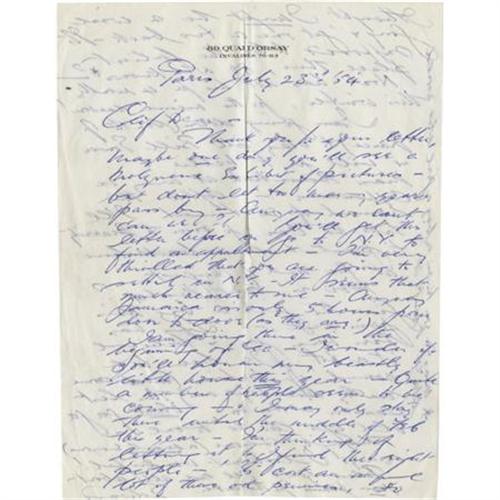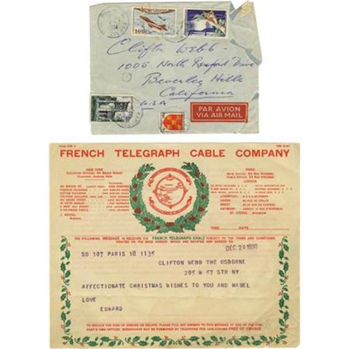 <B>Letter and Telegram to Clifton Webb from Edward, Duke of Windsor.</B></I> In writing to his friend Webb, Edward expressed his wishes to lease his home in Jamaica so that he might recoup the money he'd spent on its upkeep, as his neighbor Nol Coward had done -- "Nol has let his for 4 months this winter, for the mme reason!". Also mentioned in the correspondence is Edward's reception in society that season, on which he commented: "I've been to a round of parties... everyone (or nearly everyone) says I look just wonderful!". The letter is written on Edward's letterhead from his Quai D'Orsay office in Paris, along with the original mailing envelope with the Duke of Windsor's watermark ("DW") on its flap. A telegram from Edward to Webb is also included in this lot. Dated December 24, 1930, the telegraph relays Edward's "affectionate Christmas wishes" to Webb and his mother Mabel. Both items are in Very Good to Excellent condition with slight yellowing due to age and original mailing creases.<BR><BR><b>Shipping:</b> Other (TBD) (<a target="_blank" href="http://www.heritageauctions.com/common/shipping.php">view shipping information</a>)