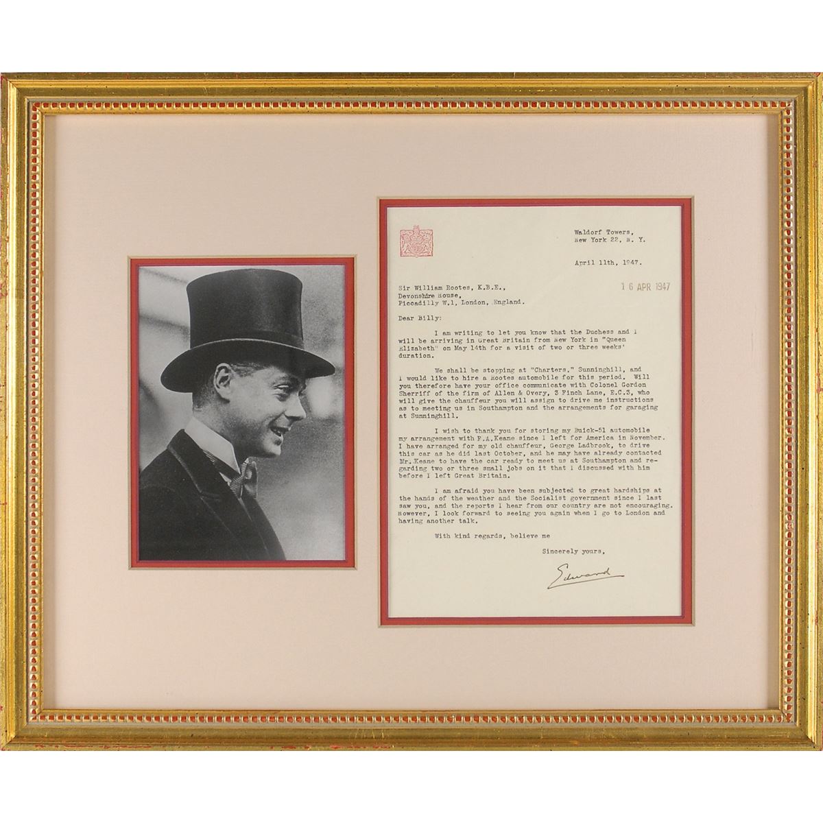 TLS signed “Edward,” one page, 6 x 8.75, personal royal crest letterhead, April 11, 1947. Letter to Sir Williams Rootes at Devonshire House in London. In part: “The Duchess and I will be arriving in Great Britain from New York in ‘Queen Elisabeth’ on May 14…We shall be stopping at ‘Charters.’ Sunninghill, and I would like to hire a Rootes automobile for this period. Will you therefore have your office communicate with Colonel Gordon Sheriff…who will give the chauffeur you will assign to drive me instruction as to meeting us…I wish to thank you for storing my Buick-51 automobile…I am afraid you have been subjected to great hardships at the hands of the weather and the Socialist government since I last saw you, and the reports I hear from our country are not encouraging.” Expertly double-matted and framed with a photo of Edward to an overall size of 17 x 14.5. In fine condition. Accompanied by an original typed telegram from Edward to Rootes, thanking him for the loan of a “Special Humber” and saying that the Buick will be used as a secondary car. Rootes was a British automaker whose Rootes Group owned the Humber brand, a maker of luxury vehicles; during World War II, Rootes oversaw the manufacture of armaments ranging from armored fighting vehicles to airplanes, and also organized the reconstruction of Coventry after its saturation bombing by the Luftwaffe in 1940. A wonderful letter combining the extravagance of British royalty with the legacy of an important industrial leader.