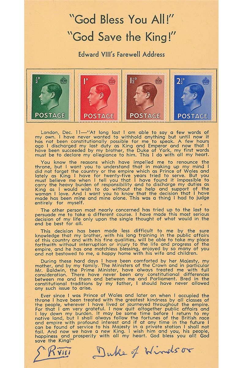 Souvenir typescript, one page on a 3.75 x 7 card bearing four affixed postage stamps. King Edward VIII’s farewell address, which famously concludes, “God bless you all! God save the King!” Signed at the bottom in blue ballpoint, “E R VIII, Duke of Windsor.” In fine condition.