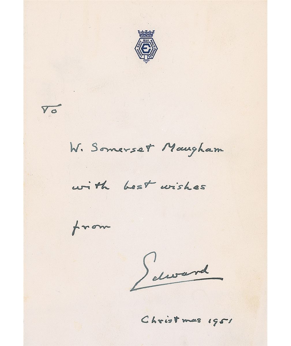ANS signed “Edward,” one page, 5 x 7, personal monogrammed letterhead, December 1951. In full: “To W. Somerset Maugham, with best wishes from Edward, Christmas 1951.” In fine condition. Letter is contained in a folded piece of paper from Maugham’s home in France, and was found laid into a hardcover edition of the Duke’s memoirs, A King’s Story, which is also present. The book bears an ownership signature of Maugham’s boyfriend Alan Searle, as well as a navy and gilt leather nameplate of Charles Posey. Book is in very good condition, with several chips and tears to the dust jacket and foxing throughout. A nice association between two significant British figures.