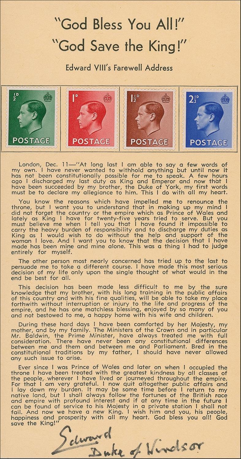 Philatelic souvenir, 3.75 x 7, bearing four commemorative postage stamps and Edward VIII’s farewell address, signed at the bottom in black felt tip, “Edward, Duke of Windsor.” In very fine condition.
