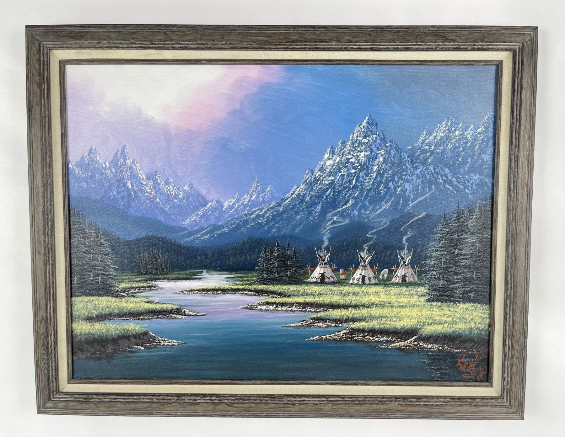 Oil on canvas. 27 1/2" by 21 1/2" framed Edward E, Jr Two Bulls (Born 1937) is active/lives in South Dakota. Edward Two Bulls is known for Indian, animal-folk art. The following was submitted in November of 2006 by Greg McCauley: Edward Two Bulls, Oglala Sioux, was born January 24, 1937, at Red Shirt Table on the Pine Ridge Indian Reservation. He attended the Seventh Day Adventist Mission School, Red Shirt, South Dakota and Oglala Community School, Pine Ridge, South Dakota. Edward Two Bulls is a self-taught artist who has been painting since the late 1950's. He once stated, he had painted 15,000 paintings in his career. His works capture the native American life, past and present and it's rich heritage. He received the Honor of a Special Exhibition organized by the Indian Arts and Crafts Board's Sioux Indian Museum in December 1978 through January 1979. The exhibit was the first comprehensive showing of paintings and sculpture by Edward Two Bulls and his sons. The brochures cover painting was titled Plains Warrior, 1977 Acrylic on canvas panel, 32" x 48" and was marked as one of the great Native American paintings of this century by the museum and its curator. The detail of the warrior, his costume and feathers was life-like. In 1967 Two Bulls exhibited his works at the Smithsonian Institution, Washington D.C.; in 1968 at the Sears Vincent Price Gallery, Chicago IL. In his career Two Bulls has exhibited his works throughout the country and painted at shows and fairs. He received a commission from the Santee Sioux Tribe to paint murals depicting important historical tribal events. Two Bulls greatest pride was teaching art to native Americans at the Shannon County School in Pine Ridge. He was the Acting Director of art for the Lakota Village Youth Home, Hermosa, South Dakota.