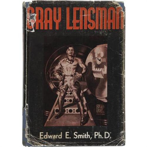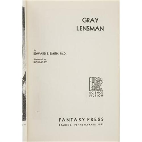 <B>Edward E. Smith. </B></I><B><I>Gray Lensman</B></I></B></I><B>.</B></I> Reading: Fantasy Press, 1951. <BR>First edition. Octavo. 306 pages.<BR><BR>Publisher's blue cloth with titles in gilt on the spine. Significant soiling to boards with an area of white stains on the rear board. Shelf wear to the edges. Contents toned with some soiling on the edges. Remnants of sticker removed from front free endpaper. Dust jacket with large area of loss at the foot of the spine, with a few smaller areas at the corners and head of spine. Moderate soiling and shelf wear to jacket. Good condition. <I>From the Robert and Diane Yaspan Collection.</B></I><BR><BR><b>Shipping:</b> Books & Catalogs (<a target="_blank" href="http://www.heritageauctions.com/common/shipping.php">view shipping information</a>)