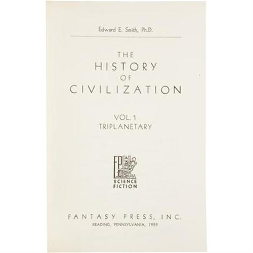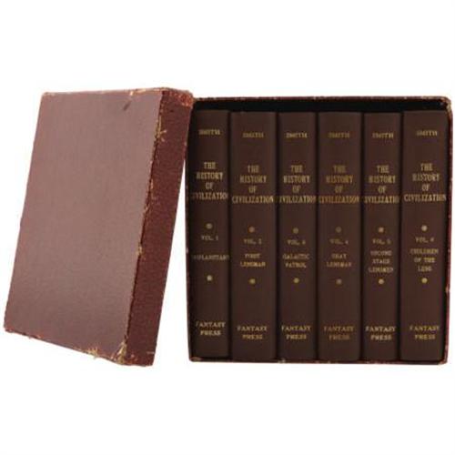<B>E. E. "Doc" Smith. </B></I><B><I>The History of Civilization:</B></I></B></I><I> </B></I><B><I>Triplanetary</B></I></B></I><B>, </B></I><B><I>First Lensman</B></I></B></I><B>, </B></I><B><I>Galactic Patrol</B></I></B></I><B>, </B></I><B><I>Gray Lensman</B></I></B></I><B>, </B></I><B><I>Second Stage Lensmen</B></I></B></I><B>, </B></I><B><I>Children of the Lens</B></I></B></I>. Reading, Pennsylvania: Fantasy Press, Inc., 1955. <BR>Special six-volume set in the publisher's rare original red cardboard box. Number 24 of 75 sets signed by the author on a limitation page bound into each volume. First volume contains a lengthy inscription from the author to a <I>"</B></I>friend of old and fellow-toiler in the vineyard of SF.<I>" </B></I>Six twelvemo volumes.<BR><BR>Publisher's original reddish-brown leather over maroon cloth, with original thick transparent plastic dust jackets, rarely seen on the books. Top edges stained red. All of the volumes show minor shelf wear from their storage in the box, and light yellow toning to the bottom edge. Overall, the set is in fine condition. The box and lid are worn, but remain intact, and are rarely seen with this set at all.<BR><BR>"Printed by Eshbach from original plates on fine linen weave paper...then bound in red half-leather with a special autograph page, all signed by the author and numbered, 60 presold before publication and inscribed to specific people, three were bound in full blue leather, one for Smith (now owned by his daughter) and two still held by Eshbach; the other 12 not resold were sold to old friends and collectors, the last one at the 1962 World SF Convention in Chicago....The box was indeed a box, not a traycase or slipcase; although form-fitting and matching (albeit in cardboard, not buckram), it actually had a shoebox-like lid. Only three sets with a lid in tact are known. Copies had thick transparent plastic jackets without imprinting so the books show through...Many sets today lack the box, or plastic, or both (the plastic discolored if shelved in sunlight for years, so many owners remove them and lose them; the books remain fine, better if the plastic's left on even if it is ugly...A legend in specialty publishing and fine bookmaking. A collector's dream...One of those specialty press productions that causes awe for many contemporary collectors." (Chalker 226) <I>From the Robert and Diane Yaspan Collection.</B></I><BR><BR><b>Shipping:</b> Books & Catalogs (<a target="_blank" href="http://www.heritageauctions.com/common/shipping.php">view shipping information</a>)