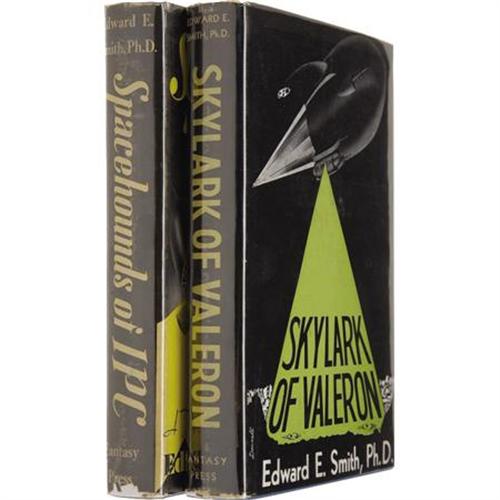 <B>Edward E. Smith: Two First Editions.</B></I> Includes the following:<BR><B><I>Spacehounds of IPC</B></I></B></I> (Reading, PA: Fantasy Press, 1949), second edition, 257 pages, blue boards, 8vo, dust jacket. Condition (book/ dj): very good/ about very good<BR><B><I>Skylark of Valeron</B></I></B></I> (Reading, PA: Fantasy Press, 1949), first edition, 252 pages, blue boards, 8vo, dust jacket. Condition (book/ dj): very good / clipped, else very good<BR><BR><b>Shipping:</b> Books & Catalogs (<a target="_blank" href="http://www.heritageauctions.com/common/shipping.php">view shipping information</a>)