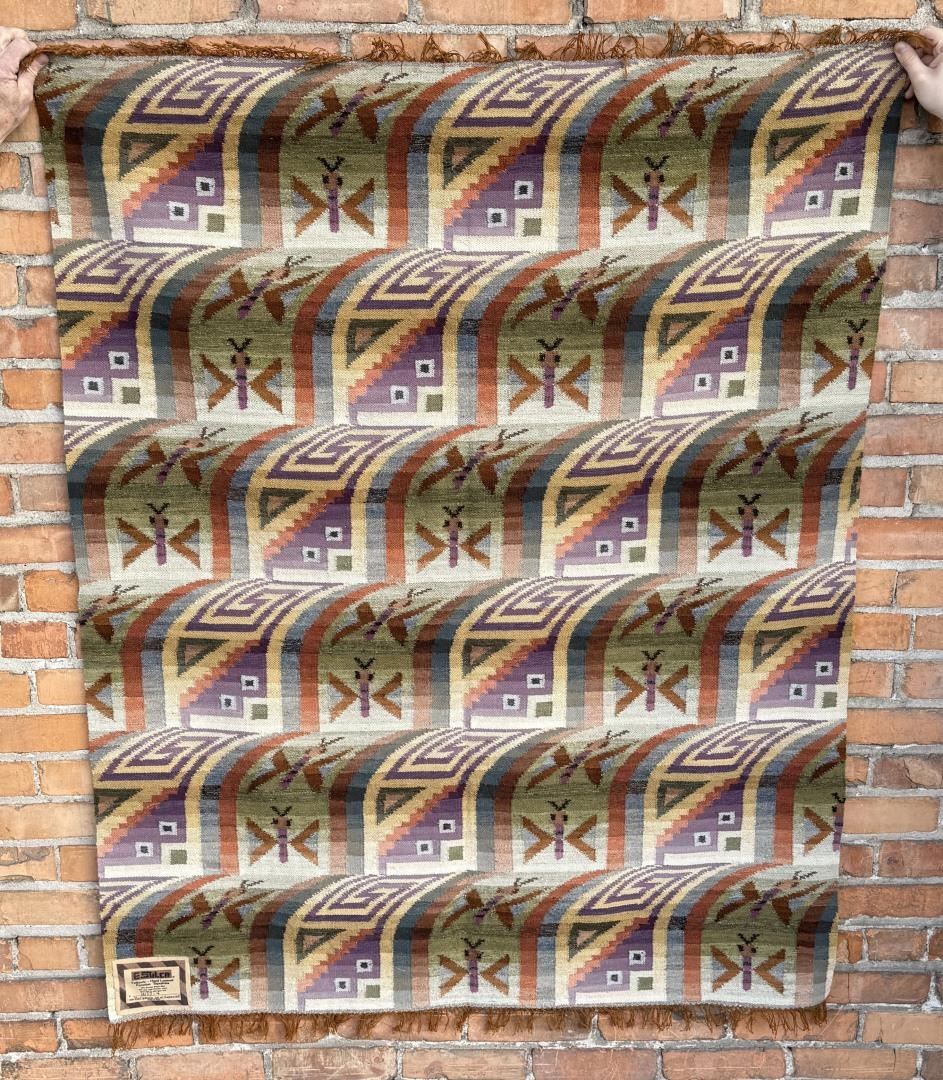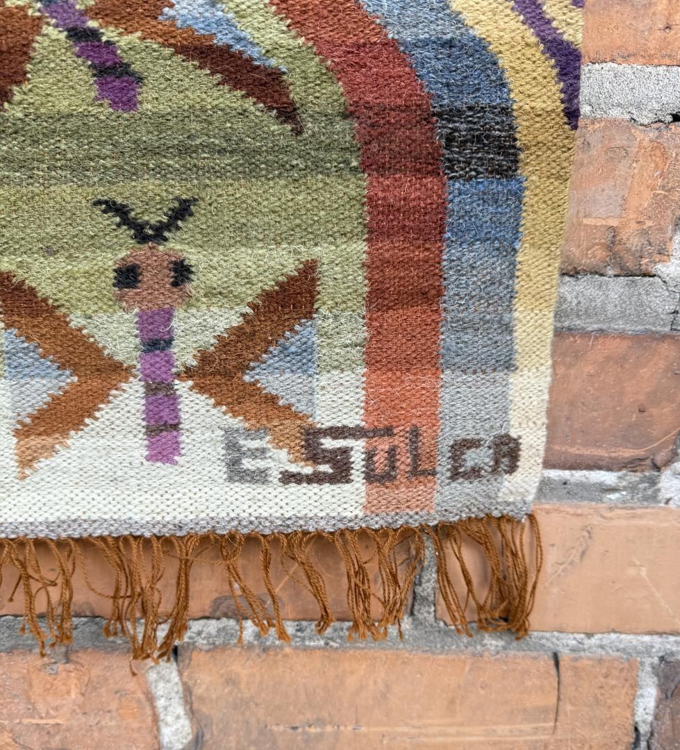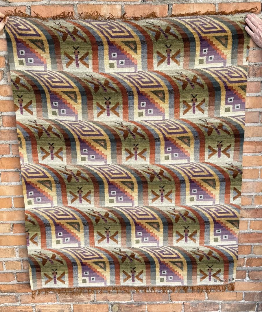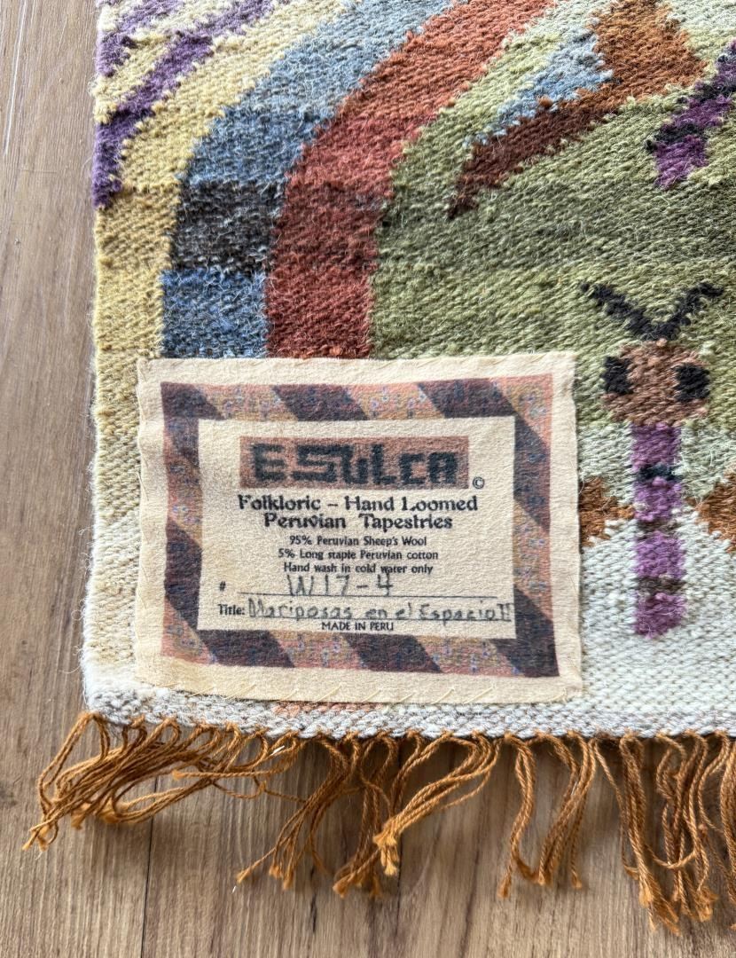 56 3/4" by 45 3/4". Title is Mariposas en el Espacio II. Native from Ayacucho, Peru, Eddie is a 3rd. Generation Award Winner tapestry weaver. His grandfather rediscovered a technique – Arwi – that took the Peruvian tapestry to the next level 100 years ago. Eddie has continued with the family tradition and now he is celebrating his 50th Anniversary as a weaver. Eddie started weaving with his grandfather when he was 10 years old. At 15 he won a prestigious award in Ayacucho and started his own atelier with a helper.