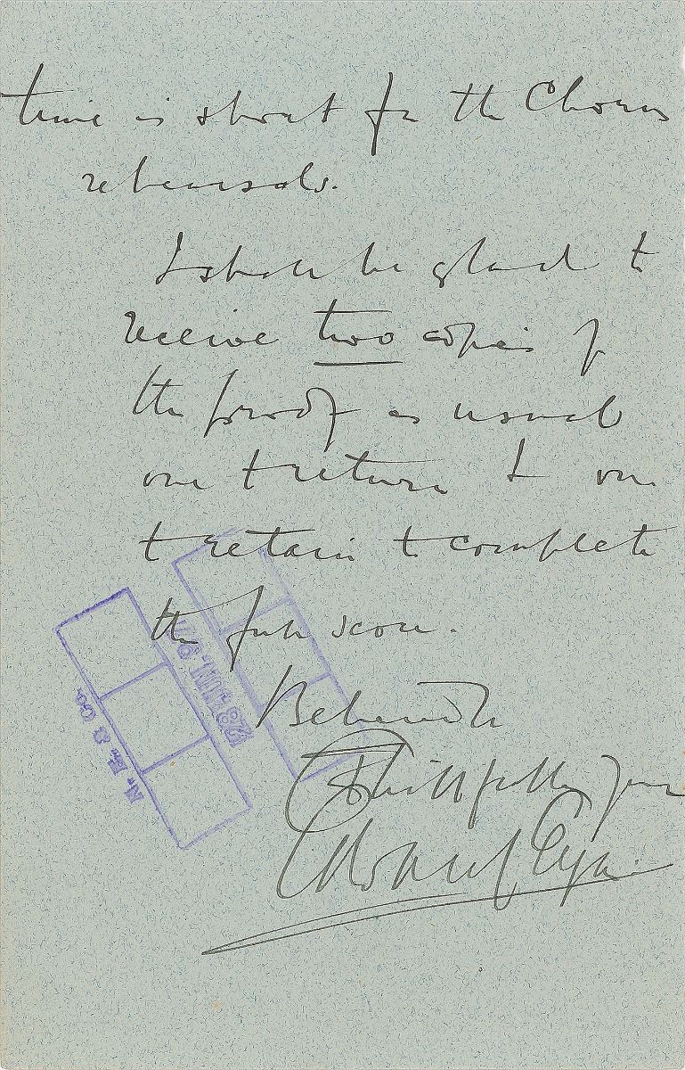 Leading English composer (1857–1934) and a significant figure among late Romantic European musicians. ALS, one page both sides, 4.5 x 7, June 26, 1897. In full: “I accept with thanks the terms offered for the Hereford ‘Te Deum & Benedictus’ in your letter of the 25th. I shall be extremely obliged if you will let me have proof as early as possible as time is short for the chorus rehearsals. I shall be glad to receive two copies of the proof as usual. One to return & one to retain & complete the full score.” In fine condition, with a block of light toning to the front, and a filing stamp touching the signature on the reverse.