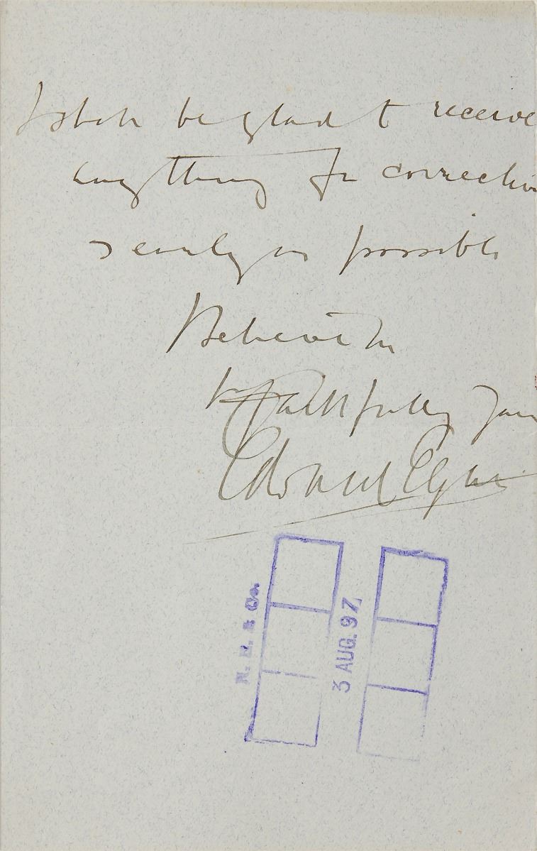 Leading English composer (1857–1934) and a significant figure among late Romantic European musicians. ALS, one page both sides, 4.5 x 7, August 2, 1897. In part: “By parcel…today I send…Te Deum and Benedictus…& shall be glad to hear if it reaches you safely. I shall be glad to receive anything for correction as early as possible.” In fine condition.