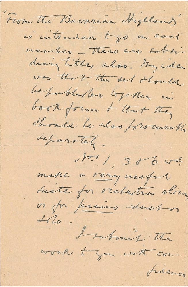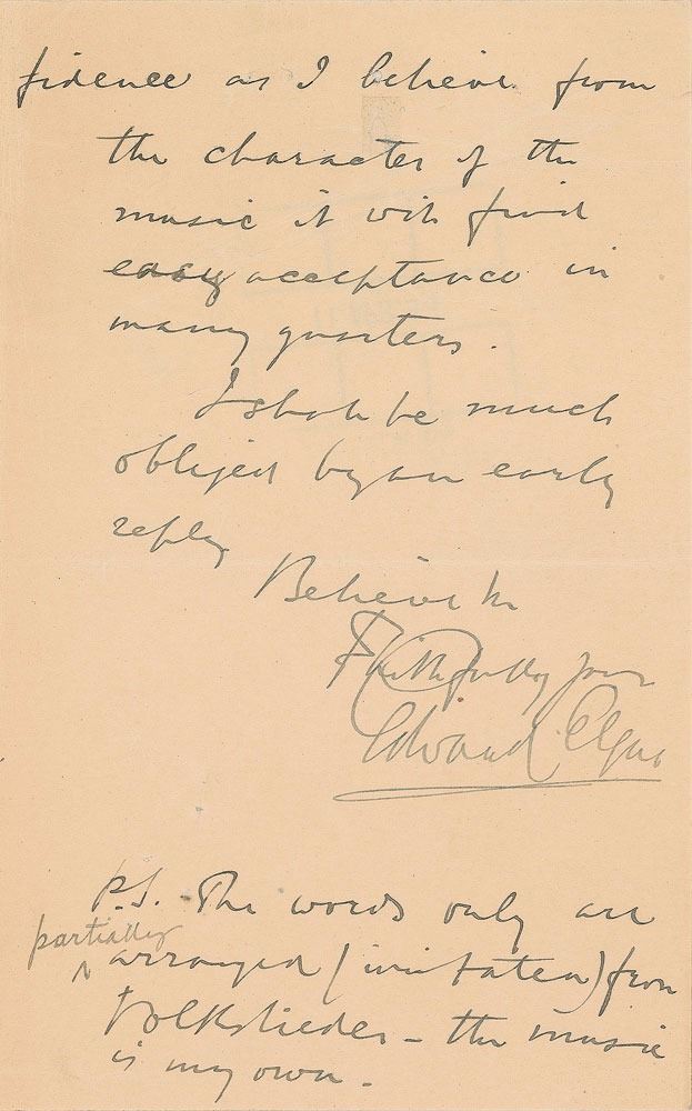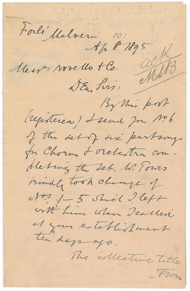 Leading English composer (1857–1934) and a significant figure among late Romantic European musicians. ALS, three pages on two adjoining sheets, 4.5 x 7, April 10, 1895. Letter to Novello & Company, in part: “By this post registered, I send you No. 6 of the set of six part songs for Chorus & orchestra completing the set. Mr. Tours kindly took charge of Nos. 1—5 which I left with him when I called at your establishment ten days ago. The collective title—’From the Bavarian Highlands’ is intended to go on each number—there are subsidiary titles also. My idea was that the set should be published together in book form & that they should be also procurable separately. Nos. 1, 3 & 6 will make a very useful suite for orchestras alone or for piano duet or solo.” Elgar adds a short postscript at the conclusion. In very good to fine condition, with some light creasing and a few staple holes touching text but affecting nothing.
