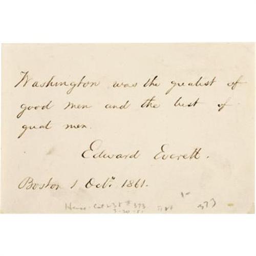 <B>Edward Everett Autograph Quote Signed,</B></I> one page 5.5" x 3.75", Boston, Massachusetts, October 1, 1861. It reads: "<I>Washington was the greatest of good men and the best of great men.</B></I>" Light stains, else very fine condition. A politician and educator, Everett served as Secretary of State during the Fillmore Administration. <I>From the collection of Henry E. Luhrs.</B></I><BR><BR><b>Shipping:</b> Miscellaneous Collectibles, Smal (<a target="_blank" href="http://www.heritageauctions.com/common/shipping.php">view shipping information</a>)