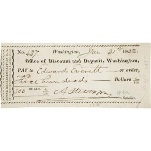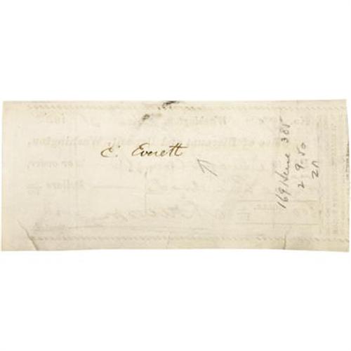 <B>Edward Everett Document Endorsement,</B></I> "<I>E. Everett</B></I>", one page, 5" x 2", Washington, D.C., January 13, 1832. A partially printed bank draft for $300 signed by Everett on the verso. Fine condition. Everett would serve as Governor of Massachusetts and, later, as U.S. Secretary of State. <I>From the collection of Henry E. Luhrs.</B></I><BR><BR><b>Shipping:</b> Miscellaneous Collectibles, Smal (<a target="_blank" href="http://www.heritageauctions.com/common/shipping.php">view shipping information</a>)
