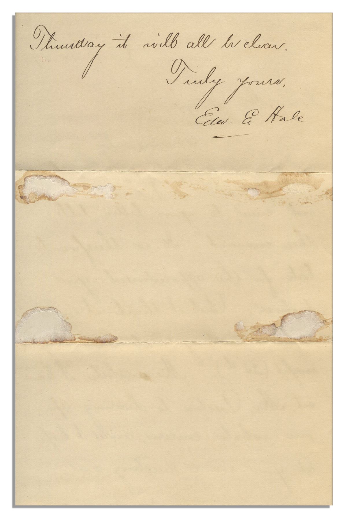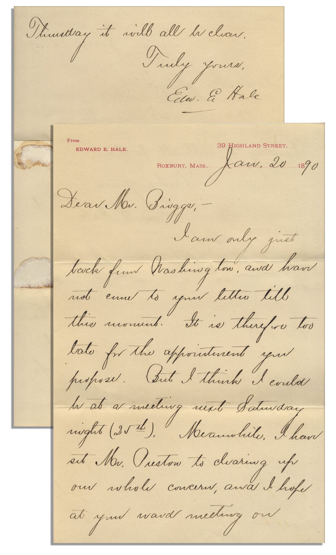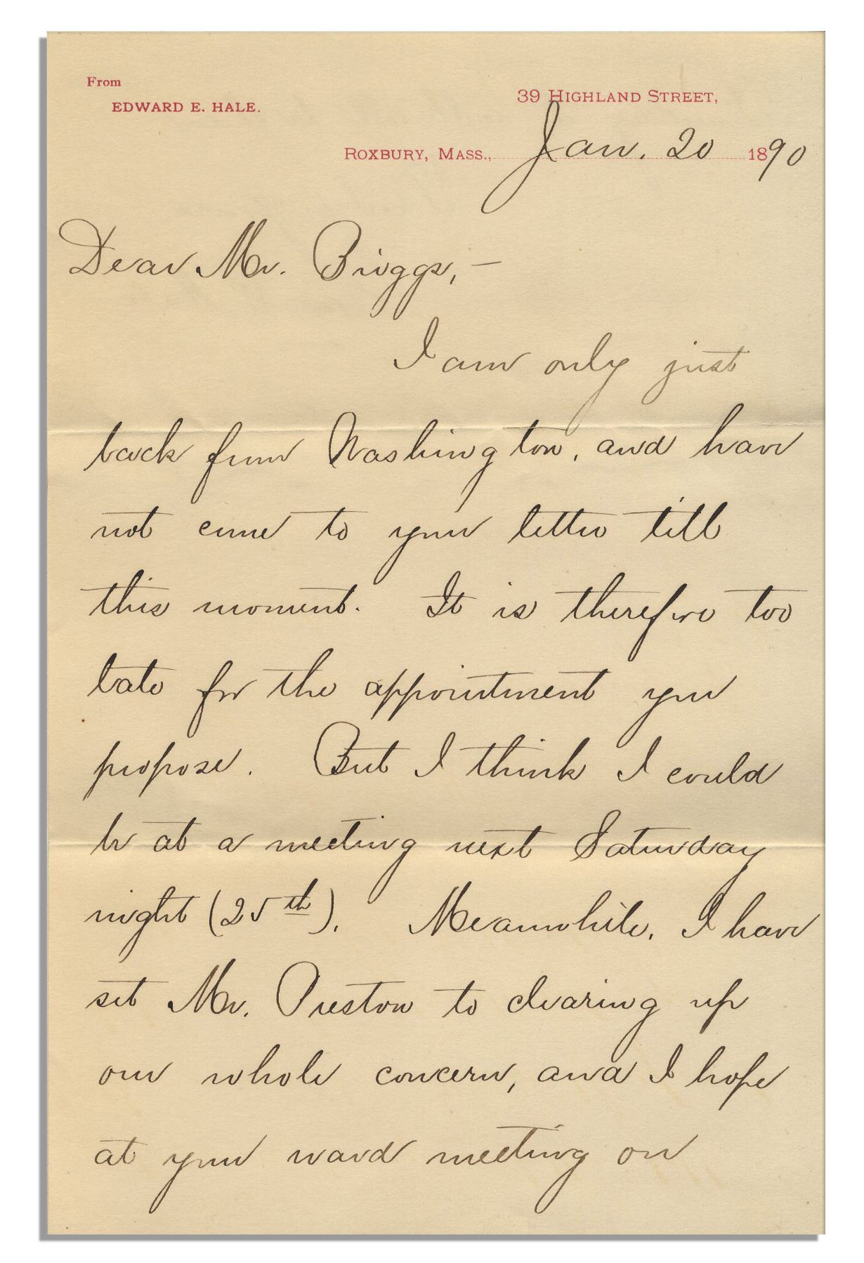 Edward Everett Hale autograph letter signed. Upon his personal stationery, datelined 20 January 1890, letter reads in full, ''Dear Mr. Briggs, I am only just back from Washington, and have not come to your letter till this moment. It is therefore too late for the appointment you propose. But I think I could be at a meeting next Saturday night (25th). Meanwhile, I have set Mr. Preston to clearing up our whole concern, and I hope at your ward meeting on Thursday it will all be clear. Truly yours, Edw. E. Hale''. Runs 2pp. on a single sheet. Measures 5.25'' x 8''. Toning and mounting remnants to one panel of verso, else near fine.