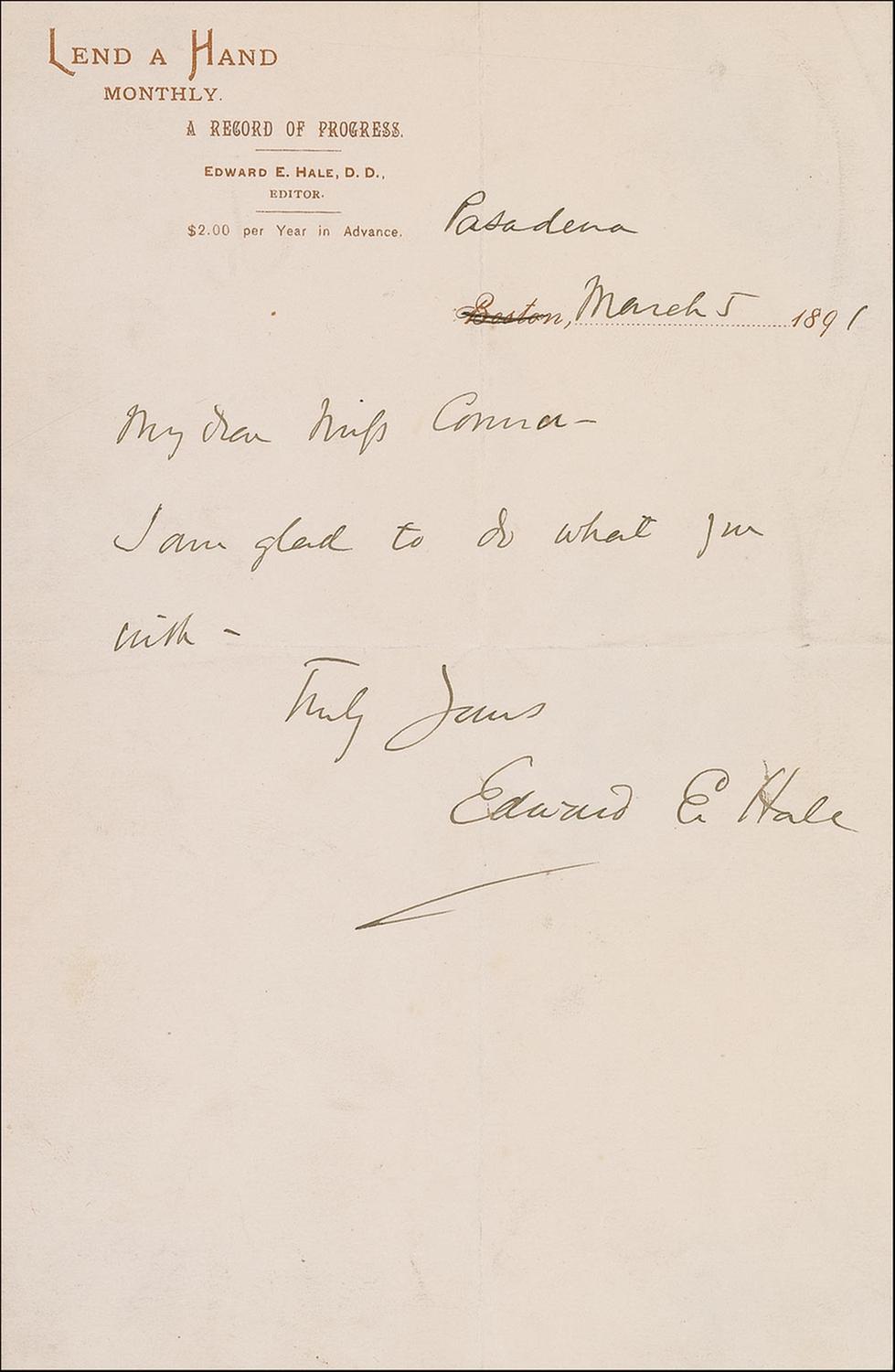 American clergyman and author (1822–1909) best known for the Civil War allegory ‘The Man Without a Country.’ ALS signed “Edward E. Hale,” one page, 5.25 x 8, Lend a Hand Monthly letterhead, March 5, 1891. Brief note to a woman. In full: “I am glad to do what you wish.” Central horizontal and vertical fold, one through a single letter of signature, a few creases, and mounting remnants to reverse, otherwise fine condition.