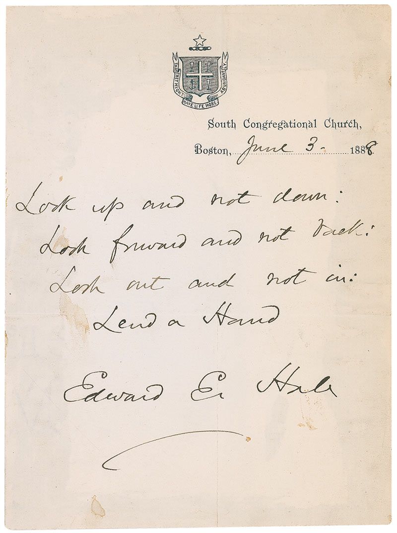 AQS, signed “Edward E. Hale,” on a 5 x 7 off-white sheet of South Congregational Church stationery, dated June 3, 1888. Hale pens a quote from ‘Ten Times One Is Ten.’ In full: “Look up and not down, look forward and not back, look out and not in: lend a hand.” Sheet is affixed to an identical size sheet. In very good condition, with central horizontal and vertical fold, scattered toning and soiling, and mounting remnants to reverse.