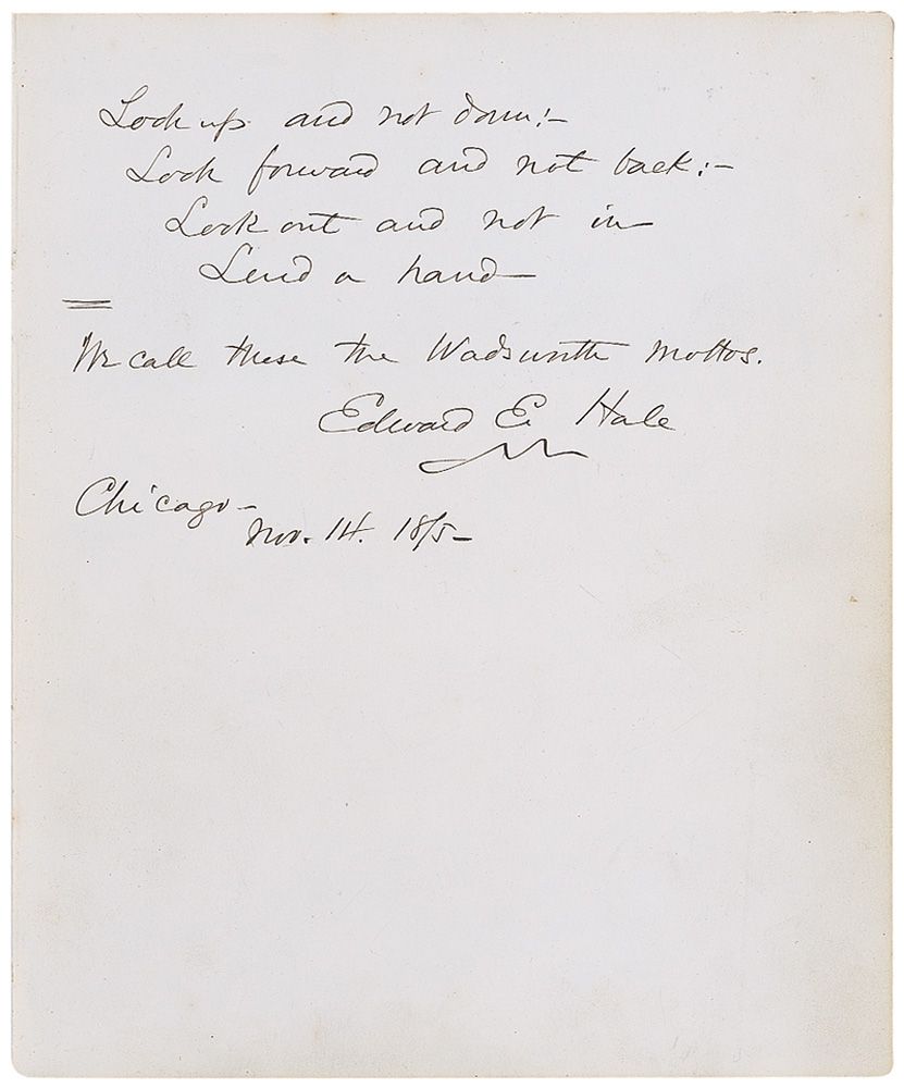 AQS on an off-white 7 x 8.25 album page. Hale writes, “Look up and not down; Look forward and not back; Look out and not in; Lend a Hand.” Signed at the conclusion, “Edward E. Hale, Chicago, Nov. 14, 18/5-.” In fine condition, with some mild edge toning and a crease to right side.