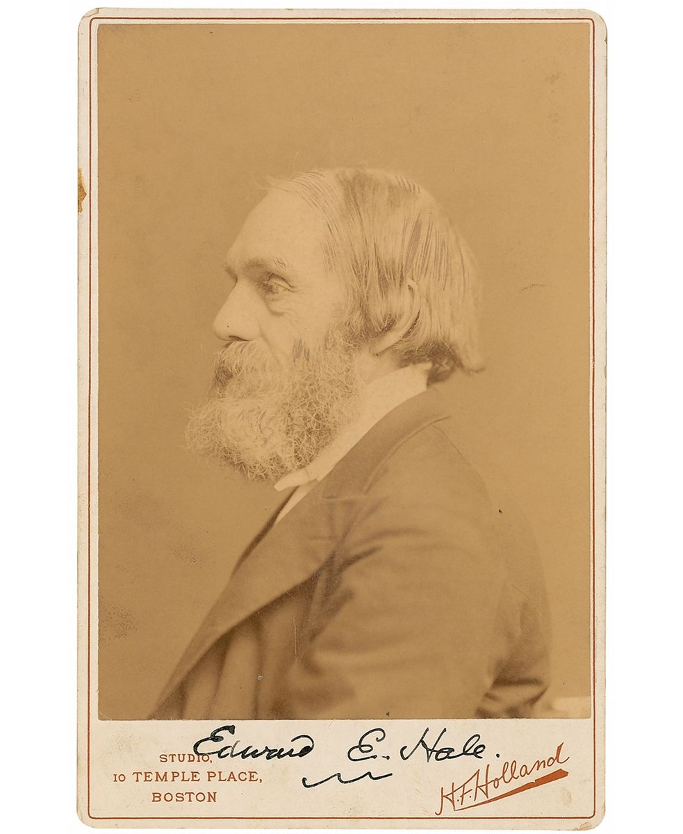 American clergyman and author (1822–1909) best known for the Civil War allegory ‘The Man Without a Country.’ Original 4.25 x 6.5 cabinet profile photo by H. F. Holland of Boston, boldly signed in the lower border in black ink. Some photographer highlights to image, mild silvering to darker areas of image, and some mounting remnants to reverse, otherwise fine condition.