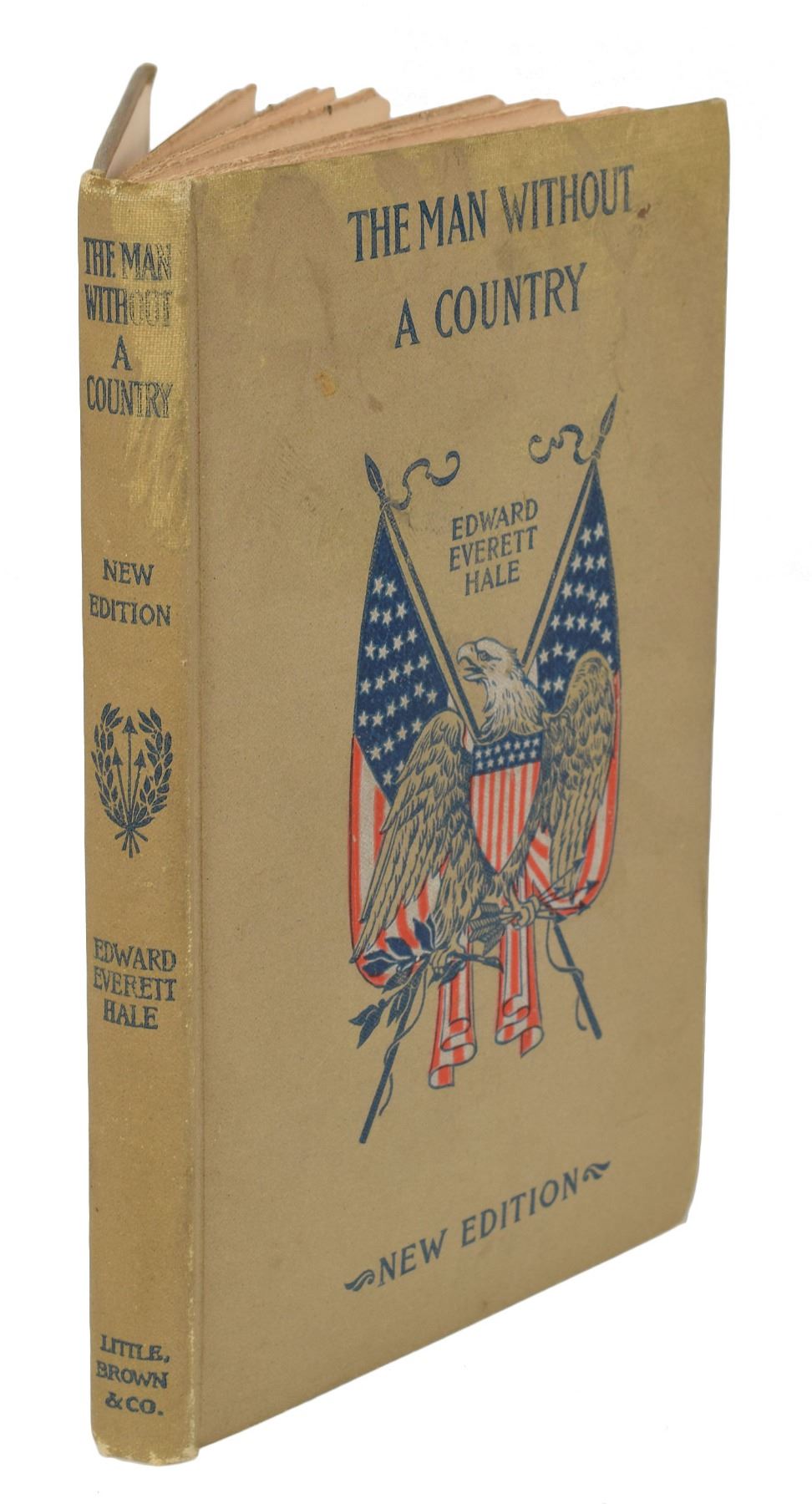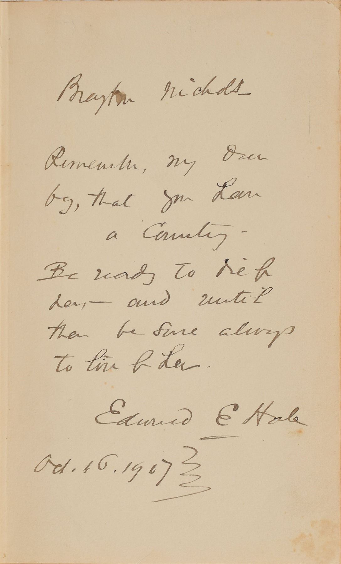Signed book: The Man Without a Country. Later printing. Boston: Little, Brown, and Company, 1904. Hardcover, 4.5 x 7, 59 pages. Signed and inscribed on the first free end page in ink, "Brayton Nichols, Remember, my dear boy, that you have a Country. Be ready to die for her—and until then be sure always to live for her, Edward E. Hale, Oct. 16, 1907." In fine condition, with light soiling and scuffing to the covers.
