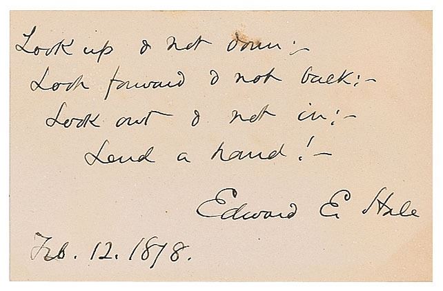American author and Unitarian clergyman (1822–1909) remembered for his short story 'The Man Without a Country.' AQS on an off-white 3.5 x 2.25 card, signed at the conclusion, "Edward E. Hale, Feb. 12, 1878." Hale pens his 'Four Mottos,' in full: "Look up & not down:— / Look forward & not back:— / Look out & not in:— / Lend a hand!" In fine condition.