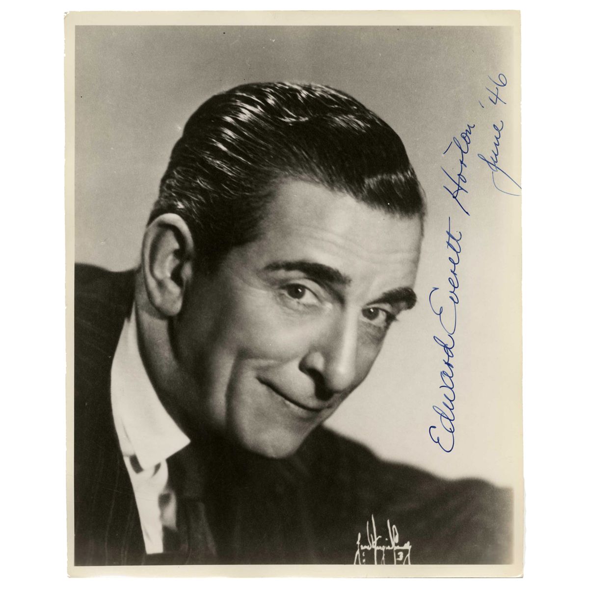 Character actor Edward Everett Horton photo signed. Black and white photo is signed ''Edward Everett Horton / June '46'' in blue. Glossy photo measures 8'' x 10''. Near fine.