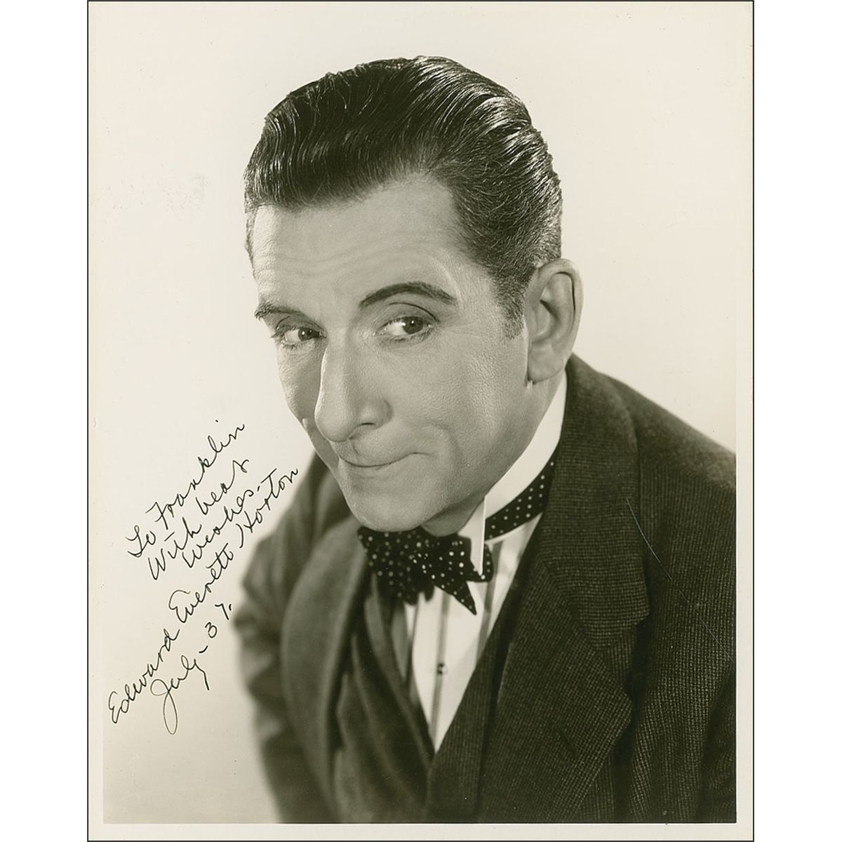 Vintage glossy 8 x 10 head-and-shoulders photo of Horton in a suit and bow tie, signed and inscribed in fountain pen, “To Franklin, With best wishes, Edward Everett Horton, July–37.” In fine condition, with a trivial ding along the right edge and a slightly trimmed edge.