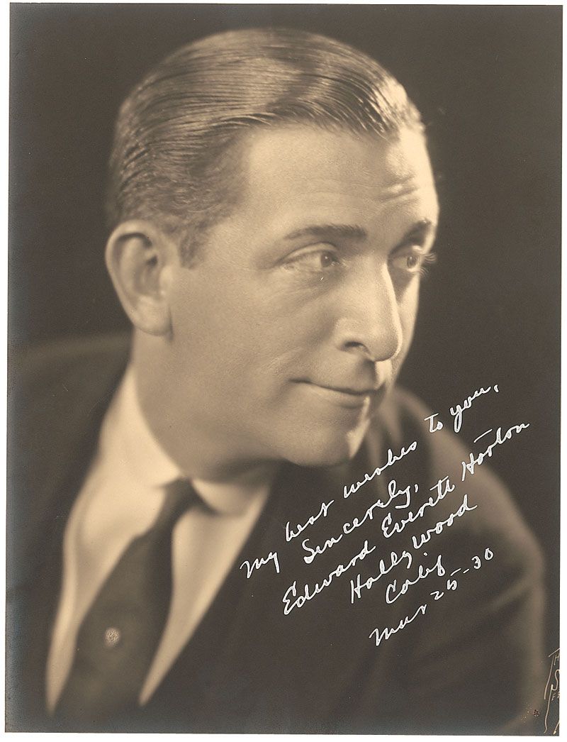 Vintage matte-finish 6.75 x 9 head-and-shoulders photo, signed and inscribed in white ink “My best wishes to you, Sincerely, Edward Everett Horton, Hollywood, Calif. Mar 25-30.” In fine condition, with trimmed edges and some light silvering to edges.