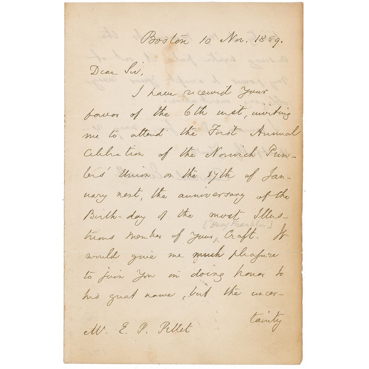 ALS, one page both sides, 5 x 7.5, November 10, 1859. In a letter to W. E. P. Pellet, Everett writes, in part: “I have received your favor of the 6th…writing me to attend the First Annual Celebrations of the Norwich Punters’ Union on the 24th of January, the anniversary of the Birth-day of the most Illustrious member of your craft. It shall give me much pleasure to join you…but the uncertainly of my movements the ensuing winter puts it out of my power…” In very good condition, with scattered toning, a few small areas of soiling, and a few small separations along the mailing folds.
