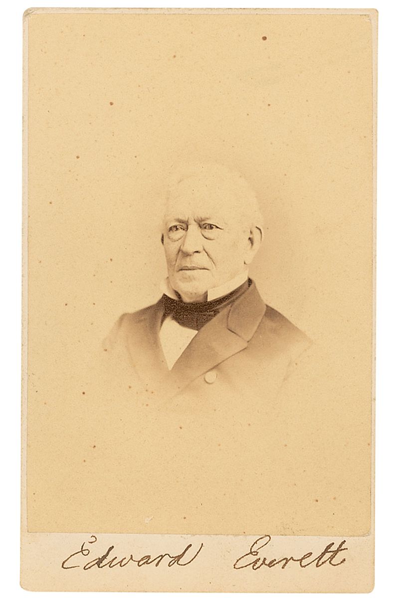 American statesman (1794–1865) renowned for his oratory, best remembered for giving the speech preceding Lincoln’s Gettysburg Address. Original 2.25 x 4 carte-de-visite bust portrait of Everett, signed in the lower border in black ink, and signed and inscribed on the reverse, “For Miss Marie Tillotson, in the hope that she will relent, and grant him the much desired reward. E. E., Philadelphia, 5 Dec. 1863.” Published by F. Gutekunst of Philadelphia. In fine condition, with a light area of toning to the reverse (slightly affecting the inscription).