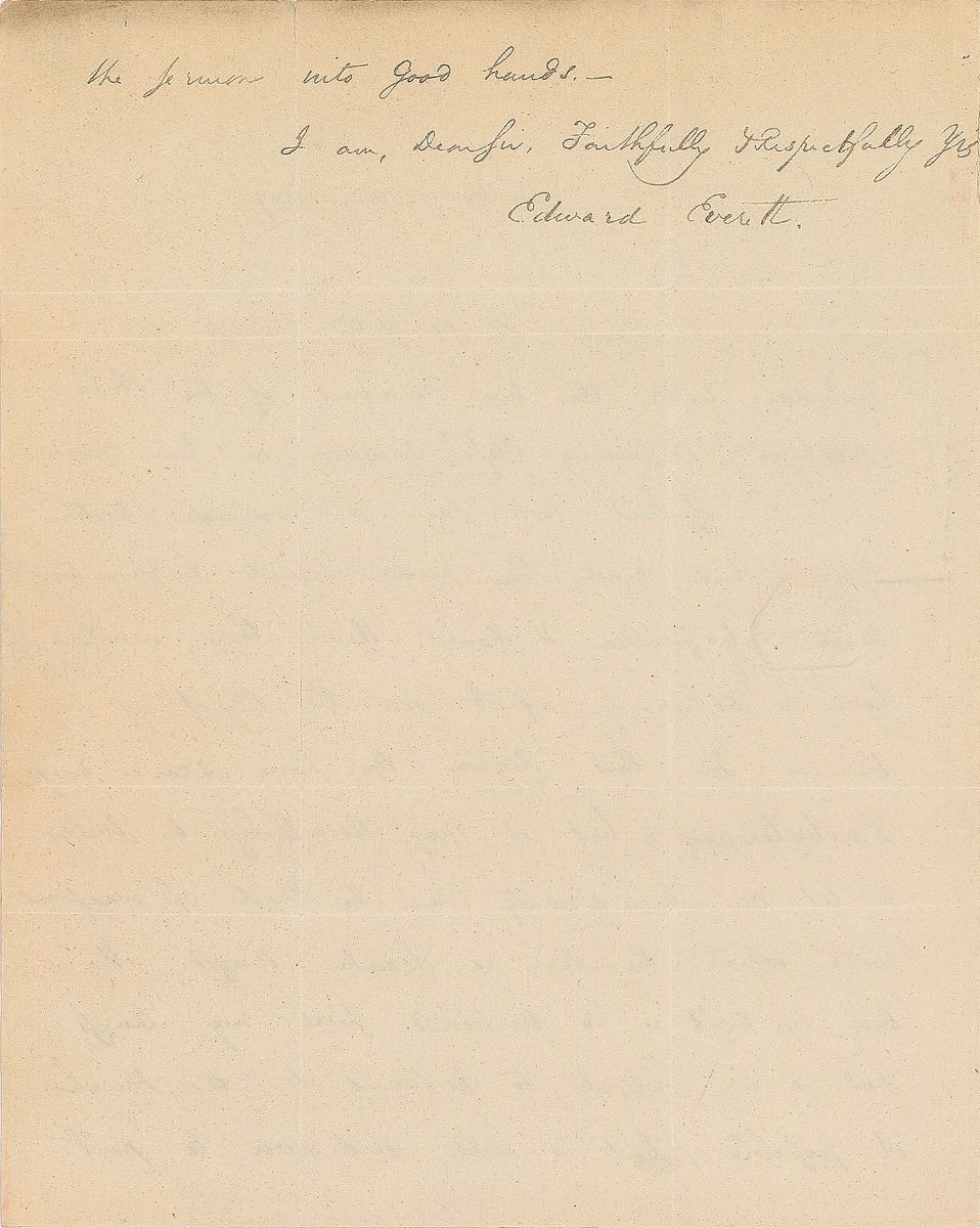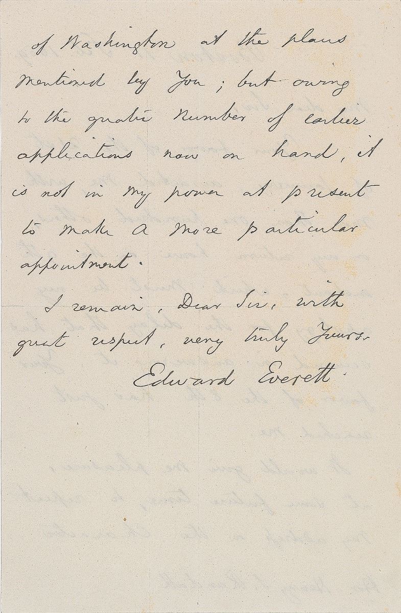 American statesman (1794–1865) renowned for his oratory, best remembered for giving the speech preceding Lincoln’s Gettysburg Address. Two ALSs, four total pages, 4.75 x 7.25 and 7.25 x 9. The first, dated August 13, 1827, in part: “In this Region we have scarce any Presbyterians; but it may nevertheless be well to let our community see the kind of weapons with which the war is elsewhere waged. My own eye sight is so wretched since my illness that I am obliged to husband it, as much as possible, but I will endeavor to put the sermon into good hands”; the second, dated February 11, 1859, in part: “It would give me pleasure, at some future time, to repeat my address on the character of Washington at the plans mentioned by you; but owing to the greater number of earlier applications now on hand, it is not in my power at present to make a more particular appointment.” In overall fine condition.